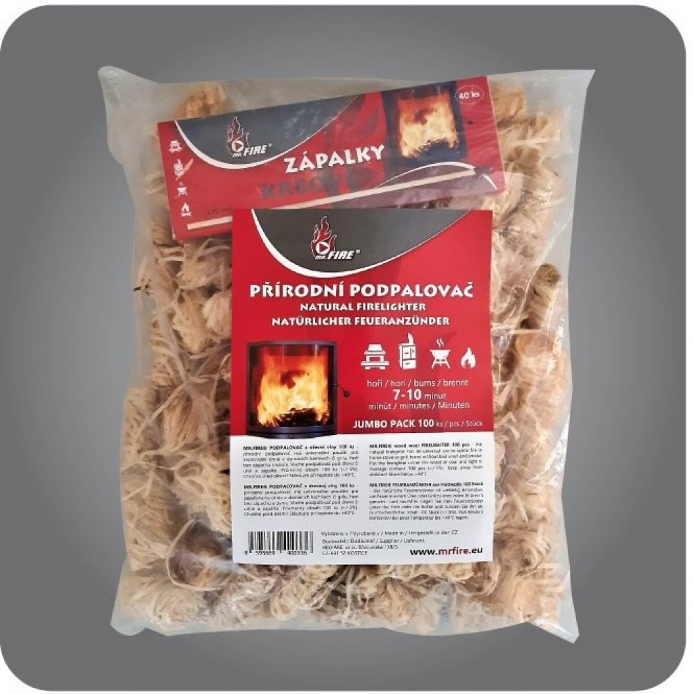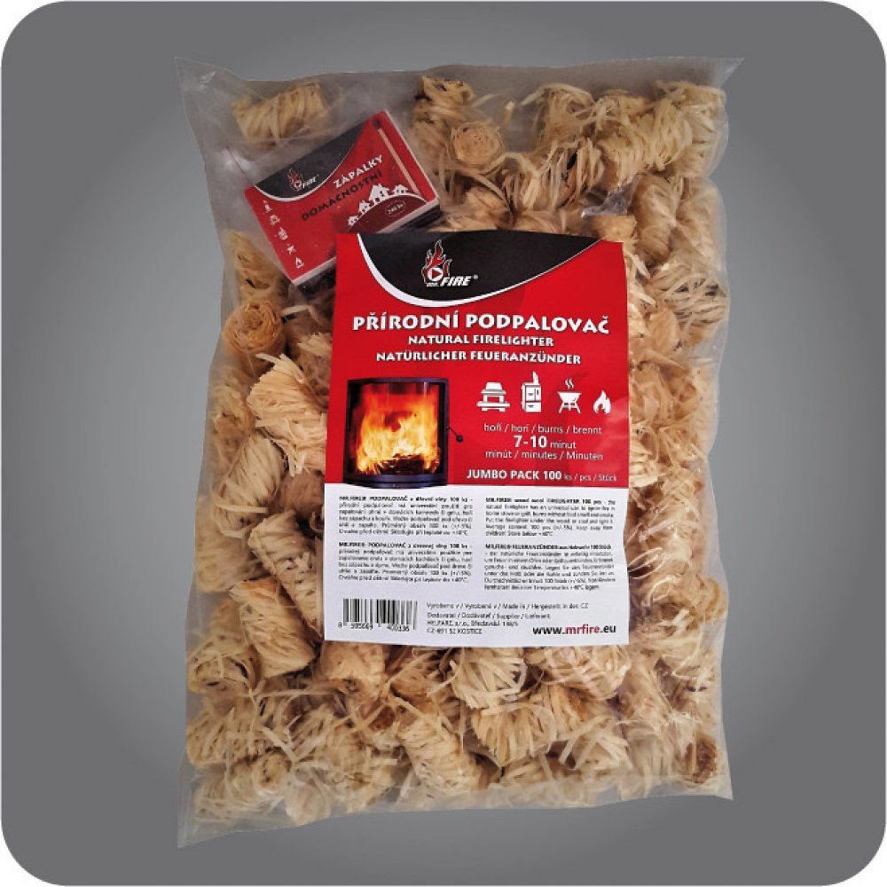 JUMBO balení univerzálního přírodního podpalovače z dřevní vlny s domácnostními zápalkami zdarma. Přírodní podpalovač má univerzální použití pro zapalování ohně v domácích kamnech, krbu či grilu.