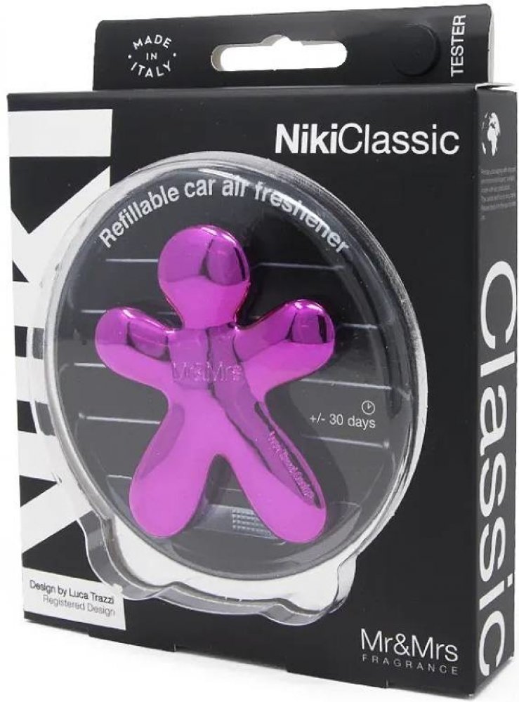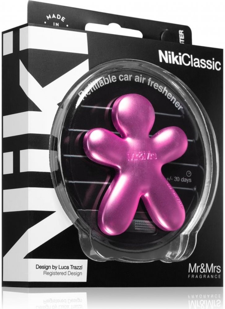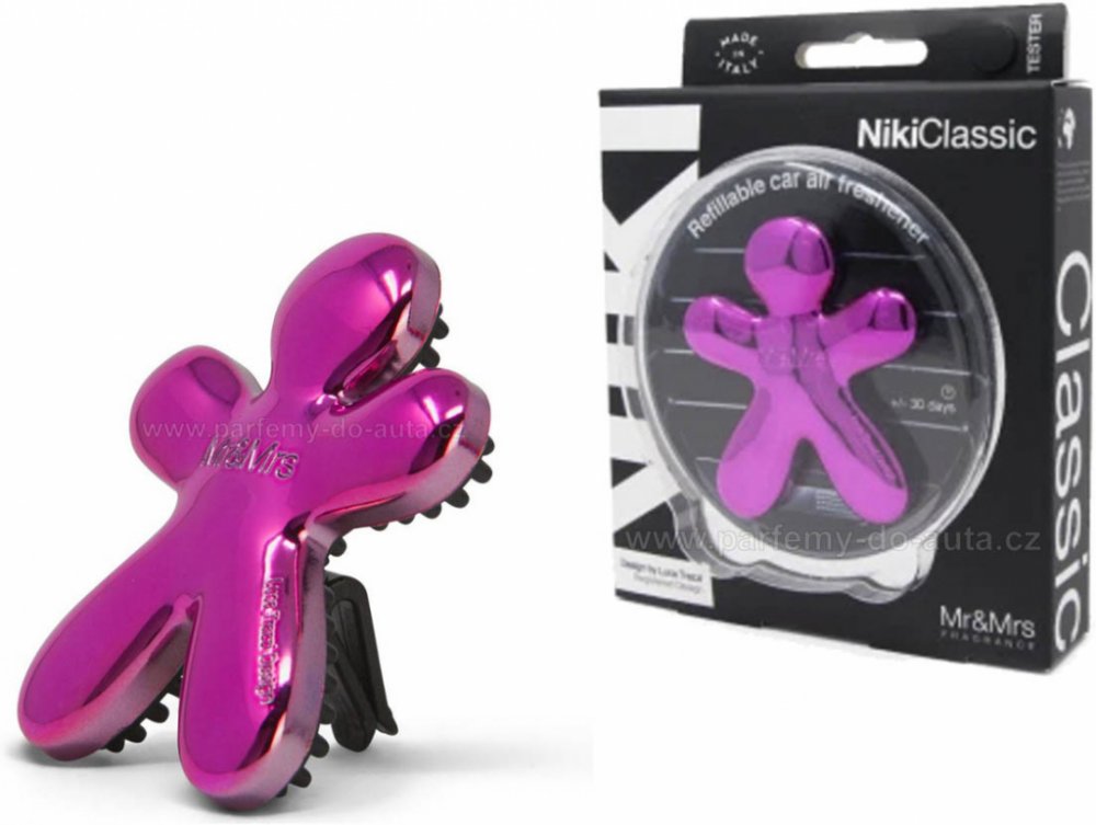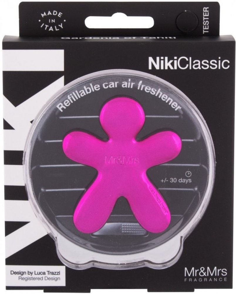 Luxusní vůně do auta Mr&Mrs Fragrance Niki Gardenia Di Tahiti Za pomoci univerzálního funkčního klipu připevníte vůni (vertikálně nebo horizontálně) na větrací otvory (vývod klimatizace) každého auta. Vůně do auta pak za pomoci proudícího vzduchu rozvádí stálou a dlouhotrvající vůni. Můžete použít EVA náplň napuštěnou aroma olejem dle výběru, kterou můžete snadno nahradit novou náplní. Balení včetně iniciální náplně, kterou je možné kdykoliv vyměnit za jednu z 15 jiných alternativ. Provoňte vaše auto s vůní Gardenia Di Tahiti (tahitská zahrada)! Vůně do ventilace Mr&Mrs Fragrance z řady Niki Vůně Niki vydrží vonět 2 až 3 měsíce (dle našich zkušeností i výrazně déle). Je vyrobena z netoxického polymeru a termoplastu tzv. EVA, neobsahuje alkohol ani žádné jiné dráždivé látky, naopak krásně a podmanivě voní. Produkty Mr&Mrs Fragrance se mohou pochlubit prestižním certifikátem organizace IFRA (International Fragrance Association), která kontroluje kvalitu a zdravotní nezávadnost vonných esencí. Zákazník má tedy jistotu, že výrobky Mr&Mrs Fragrance neobsahují žádné škodlivé složky. Vyrobeno v Itálii, design od úspěšného italského designéra Luca Trazzi. Rozměry jsou 6,5 cm x 5,5 cm x 2 cm.