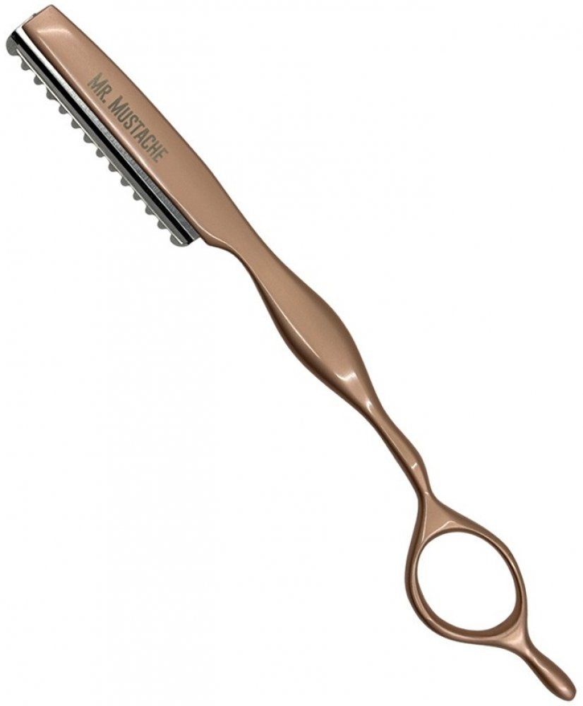 Profesionální efilační břitva na seřezávání vlasů MR. MUSTACHE pro přesné prostříhávání a texturu. Nerezová ocel, ergonomická rukojeť, ostrá vyměnitelná čepel. Varianta Rose gold má barvu růžového zlata.