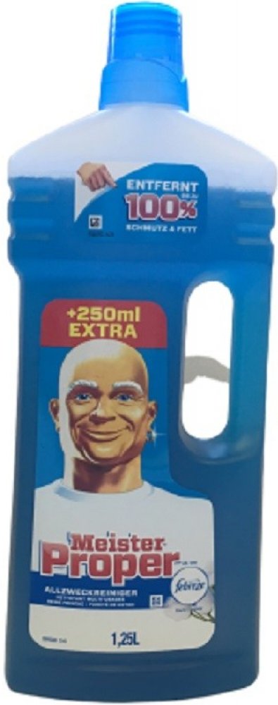 Pak musíte mít Meister Proper se svěží jarní vůní . Univerzální čisticí prostředek se svěží jarní vůní. Brilantní lesk, vhodný na omyvatelné povrchy. 2 uzávěry vystačí na 5 l vody. Pro rychlé a snadné umývání podlah a velkých ploch. Jeho složení s bezpečnou hodnotou pH j vhodné pro širokou škálu povrchových materiálů včetně lakovaného dřeva a laminátu.