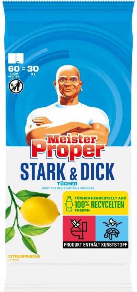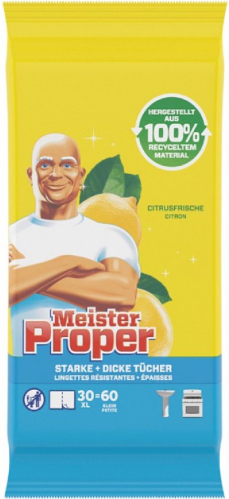Meister Proper silné čistící ubrousky s citrusovou vůní a dvojitou perforací velikosti XL 30=60ksskvělé čistící univerzální ubrousky pro použití v kuchyni i koupelně, které si poradí jak s mastnotou tak s vodním kamenem. Tyto ubrousky jsou extra velké a mají v polovině perforaci, která zajistí, že můžete ubrousek navíc rozdělit na dva. Pro běžný a pravidelný úklid tak získáte balení s 60 ubrousky...