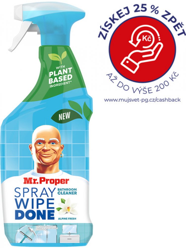 Pro odstraňování skvrn po vodních kapkách a zbytcích mýdla z povrchů v koupelně vám nabízíme sprej od značky Mr. Proper. Tento sprej dokáže bez potřeby drhnutí a bez vytváření šmouh odstranit nečistoty ze všech koupelnových povrchů. Navíc po použití zanechává zářivou čistotu a oslnivý lesk, díky rostlinné složce obsahující 83 % všech povrchově aktivních látek, které procházejí odpovídajícím zpraco...