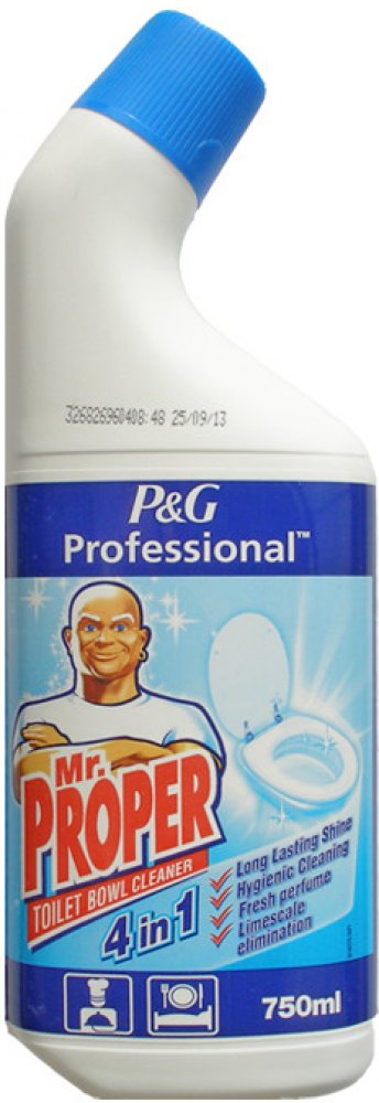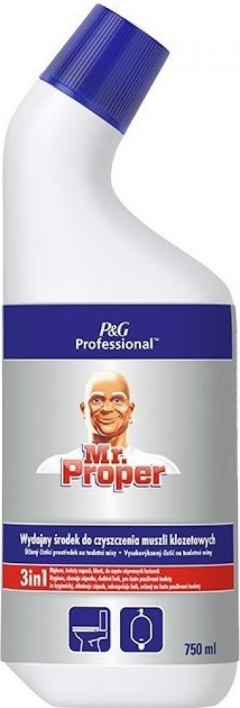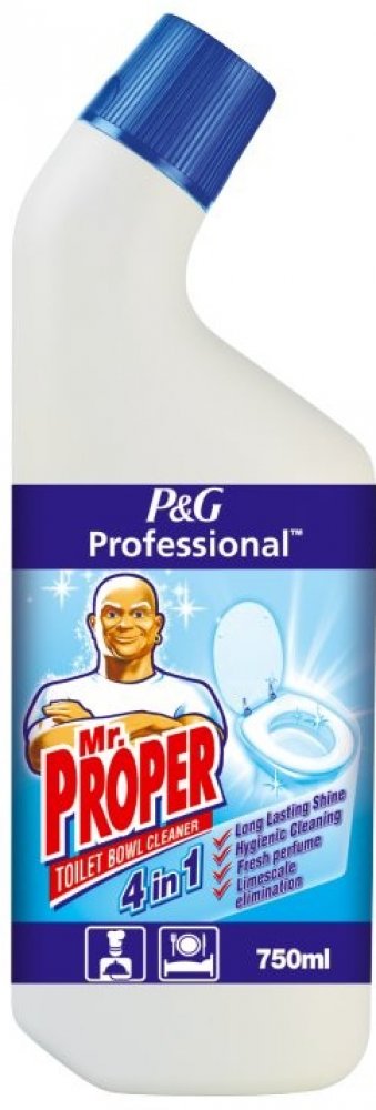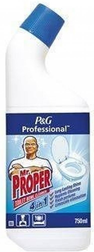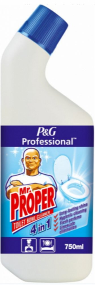 Mr.Proper professional wc čistič gel 750ml.4v1=dlouhotrvající lesk,hygienická čistota,svěží vůně.eliminace vodního kamene.Čistící prostředek Mr.Proper vám přináší hygienickou čistotu,protože je navržen tak,aby důkladně vyčistil i dolní části toaletní mísy a snadno z ní odstraní skvrny včetně vodního kamene.Tekutý prostředek na hygienické čištění toalet pisoáru pro okamžité použití. Přednosti Posky...