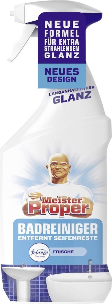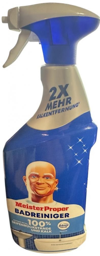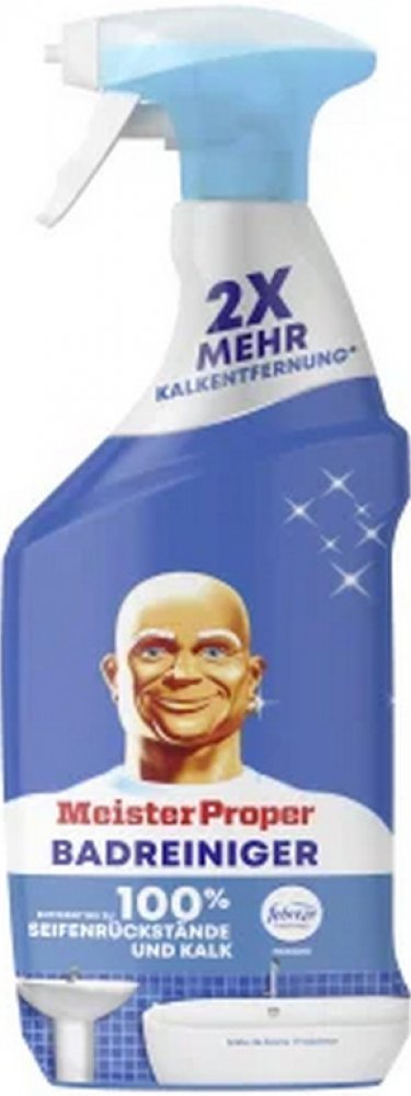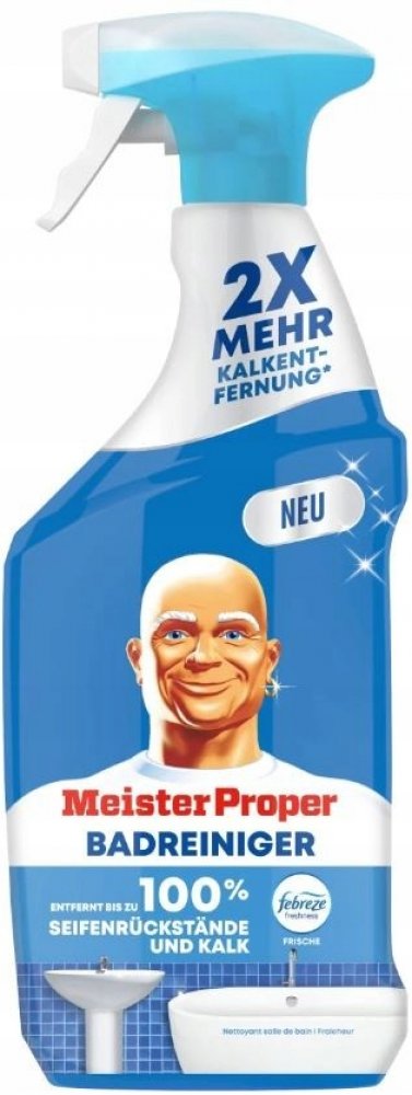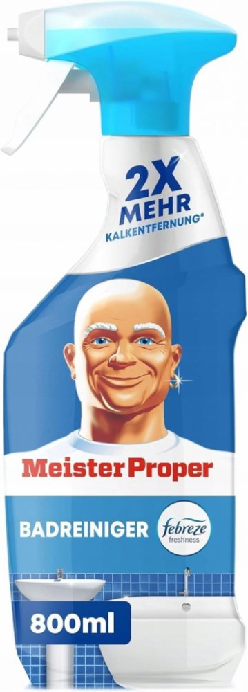 S úporným nánosem mýdla v umyvadle, sprše a vaně koupelna často vyžaduje nejvíce času a úsilí na čištění a udržování čistoty. To je důvod, proč čistič koupelen Meister Proper kombinuje čisticí sílu Meister Proper se svěžestí Febreze, aby vaší koupelně během okamžiku dodal dlouhotrvající lesk a příjemnou svěžest. Se svou schopností odstraňovat vodní kámen Meister Proper odstraňuje až 100 % mýdlových nečistot a vodního kamene. Nyní dvakrát účinnější při odstraňování vodního kamene ve srovnání s předchozím čističem koupelen Meister Proper ve spreji! Složení navíc chrání před vodními skvrnami a novými usazeninami mýdla, takže vaše koupelna zůstane déle čistá. Tento koupelnový čistič lze snadno použít na všechny koupelnové povrchy: vany, linoleum, sprchové kouty, umyvadla, toalety, obklady a baterie. Jednoduše nastříkejte na špinavý povrch, dokud nebude zcela pokryt. Poté opláchněte nebo otřete vlhkým čistým hadříkem. Odstraňuje až 100 % zbytků mýdla a vodního kamene.POUŽITÍ:Otočte tryskou z polohy STOP. Aplikujte prostředek na čištěný povrch. Nechte půbobit max 5 min. Poté opláchněte vodou.SLOŽENÍ:viz Ingredients/Inhaltsstoffe na obale.