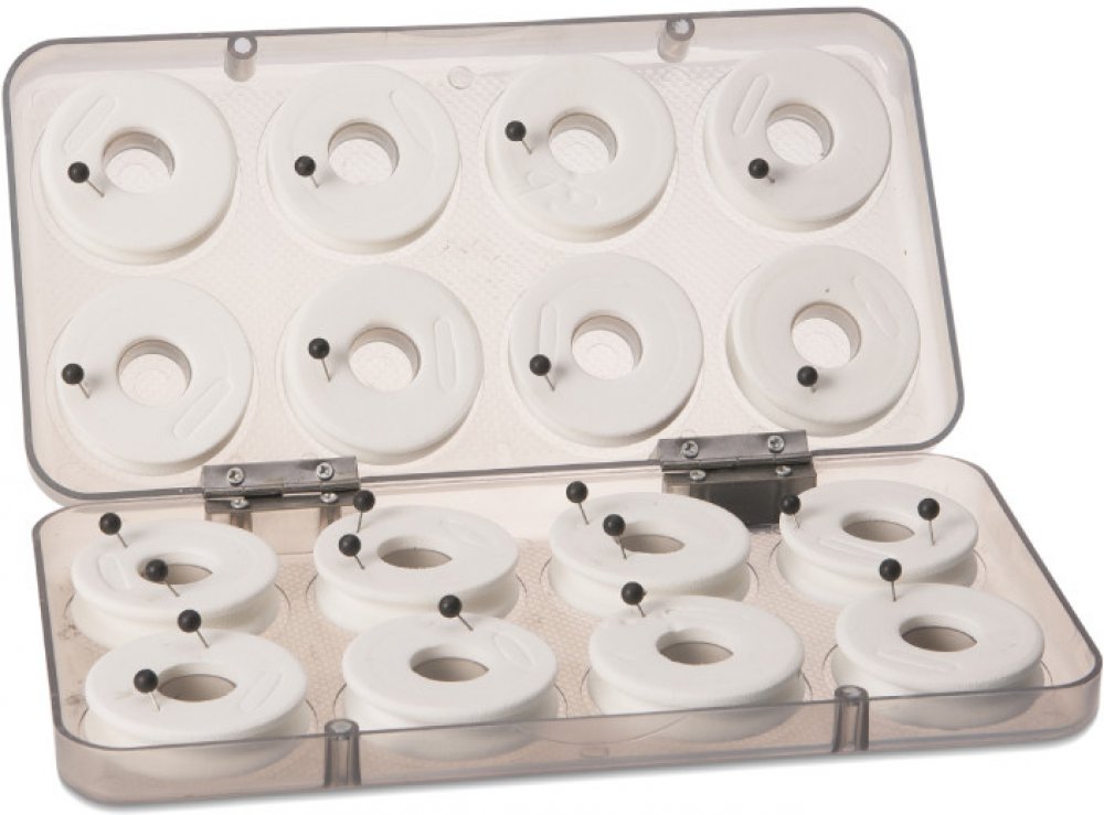 Plastové boxy s cívkami pro navíjení návazců. Cívky jsou z EVA materiálu a opatřeny špendlíky pro zajištění háčků. Boxy jsou přizpůsobené počtu cívek a jsou zajištěny magnetickým uzávěrem.