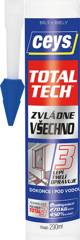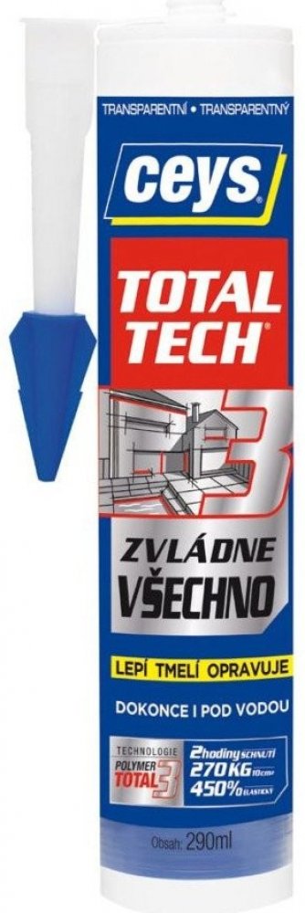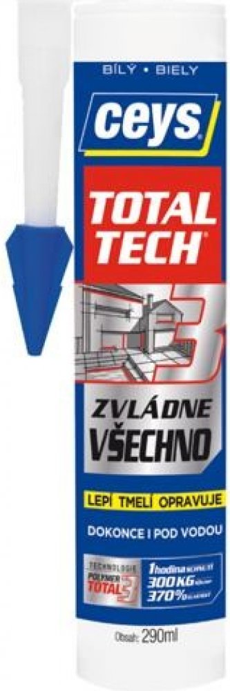 Ceys TOTAL TECH je univerzální lepidlo, které lepí a tmelí.Toto silné montážní lepidlo s vynikajícími vlastnostmi odolává teplotním změnám, stárnutí a UV paprskům.Funguje na vlhkých podkladech a byl aplikován i pod vodou s dobrými výsledky. Je vhodné na velké množství materiálů.Je odolné vůči plísni a vodě.Umožňuje pružné spojení a vytváří permanentně elastické spoje, které absorbují dilatační i stahující pohyby.Odolává nárazům a vibracím.Je speciálně vhodné pro pružné materiály.Neztrácí časem na objemu.Umožňuje spojovat nerovné plochy, které je zapotřebí vyplnit.Neobsahuje rozpouštědla a nepoškozuje tak povrchy.Vhodný pro podkladový materiál: cihla, dřevo, kov, dlažba, plast, mramor, kámen, karton, guma, kůže, měkčené plasty, beton, pokované plochy, zrcadla, vitráže...