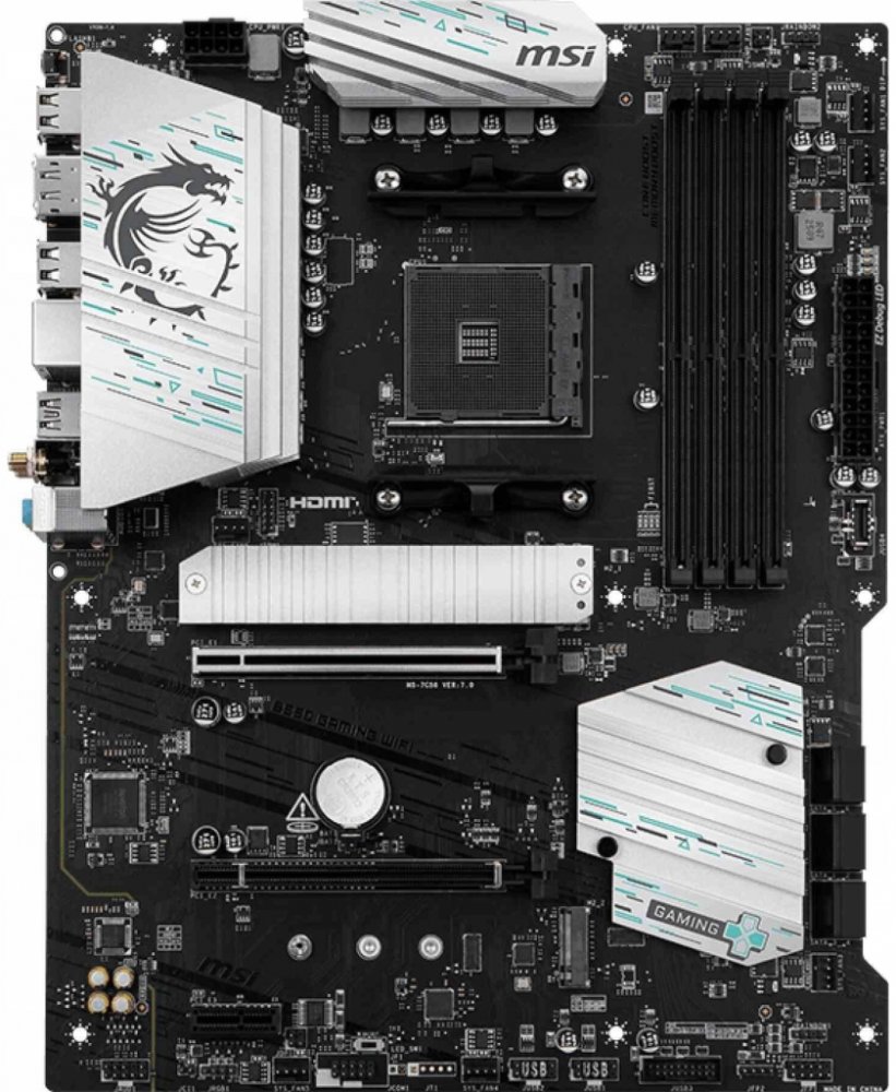 MSI B550 GAMING WIFIThe B550 GAMING WIFI is crafted to offer extensive connectivity, versatile tools, and Wi-Fi solution for gamers seeking a comprehensive experience. Featuring an 1G LAN, Wi-Fi and PCIe 4.0 solution, it is ready for 24/7 non-stop gaming optimized for AMD Ryzen™ 5000 Series, 5000 G-Series, 4000 G-Series, and 3000 Series processors.ChipsetAMD B550CPUSupports 3rd Gen AMD Ryzen™ and 3rd Gen AMD Ryzen™ with Radeon™ Graphics Desktop Processors for SockSocket AM4Memory4x DDR4, Maximum Memory Capacity 128GBMemory Support DDR4 2667/ 2800/ 2933/ 3000/ 3066/ 3200/ 3466/ 3600/ 3733/ 3866/ 4000/ 4133/ 4266/ 4400/ 4533/ 4600/ 4733/ 4800/ 4866+ MHz by A-XMP OC MODE• 1DPC 1R Max speed 4800 MHz• 1DPC 2R max speed 3866 MHZ• 2DPC 1R max speed 4000 MHZ• 2DPC 2R max speed 3600 MHZ• Dual channel memory architecture• Supports non-ECC UDIMM memory• Supports ECC UDIMM memory (non-ECC mode)• Supports un-buffered memory• Memory compatibility and supported speeds can vary depending on the CPU and memory configuration. For detailed information, please refer to the Memory Compatibility List available on the product’s Support page or visit https://www.msi.com/support/.Graphics1x HDMI™Support HDMI™ 2.1, maximum resolution of 4K 60Hz*1x DisplayPortSupport DisplayPort 1.2, maximum resolution of 4K 60Hz**Available only on processors featuring integrated graphics. Graphics specifications may vary depending on the CPU installed.Expansion Slots2x PCI-E x16 slot1x PCI-E x1 slotPCI_E1 Gen PCIe 4.0 supports up to x16 (From CPU)PCI_E3 Gen PCIe 3.0 supports up to x4 (From Chipset)PCI_E4 Gen PCIe 3.0 supports up to x1 (From Chipset)AudioRealtek ALC8977.1-Channel High Definition AudioStorage2x M.2M.2_1 Source (From CPU) supports up to PCIe 4.0 x4 / SATA mode, supports 22110/2280/2260/2242 devicesM.2_2 Source (From Chipset) supports up to PCIe 3.0 x4 , supports 2280 devices6x SATA 6GMulti-GPUAMD MULTI-GPU SupportUSB4x USB 2.0 (Rear)4x USB 2.0 (Front)2x USB 5Gbps Type A (Rear)2x USB 5Gbps Type A (Front)1x USB 5Gbps Type C (Front)1x USB 10Gbps Type A (Rear)1x USB 10Gbps Type C (Rear)LANRealtek 8111H 1G LANInternal I/O Connectors1x Power Connector(ATX_PWR)1x Power Connector(CPU_PWR)1x CPU Fan1x Pump Fan6x System Fan2x Front Panel (JFP)1x Chassis Intrusion (JCI)1x Front Audio (JAUD)1x Com Port (JCOM)2x Addressable RGB LED connector(JRAINBOW)1x RGB LED connector(JRGB)1x TPM pin header(Support TPM 2.0)4x USB 2.0 ports1x USB 5Gbps Type A ports1x USB 5Gbps Type C portsWireless Communication moduleWi-Fi 5 SolutionSupports Bluetooth 5.0LED FEATURE4x EZ Debug LEDBack Panel I/O PortsUSB 2.0DisplayPort 1.21G LANUSB 10Gbps (Type-A)Wi-Fi / BluetoothAudio ConnectorsFlash BIOS ButtonHDMI™USB 2.0USB 5Gbps (Type-A)USB 10Gbps (Type-C)Operating SystemSupport for Windows 11 64-bitBOX CONTENTForm FactorATX243.84mmx304.8mm
