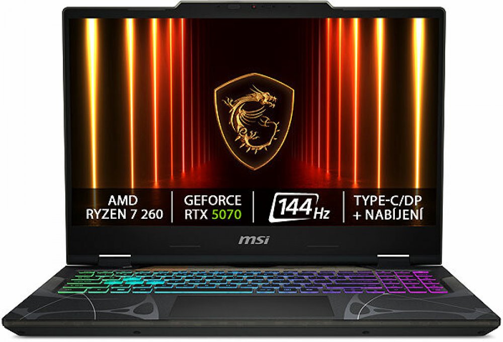 AMD Ryzen 7 260, 15.6" IPS antireflexní 1920 × 1080 144Hz, RAM 32GB DDR5, NVIDIA GeForce RTX 5070 8GB, SSD 1000GB, numerická klávesnice, podsvícená RGB klávesnice, copilot, webkamera, USB 3.2 Gen 1, USB-C, WiFi 6E, Bluetooth, hmotnost 2,1 kg, bez operačního systému (9S7-15QL42-081)