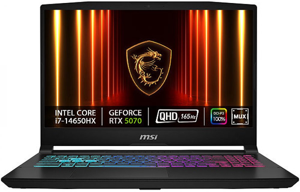 Intel Core i7 16 16 GB DDR5 15.6 palce 2560 x 1440 165 Hz 16 : 9 antireflexní displej excelentní/profesionální NVIDIA GeForce RTX 5070 8 GB dedikovaná karta WiFi 6E 2.4 kg černé bez OS MSI MSI Katana ne, slyšitelný ventilátor RGB podsvícená, kompaktní 1000 GB výkonný notebook 3 bez AI akcelerace