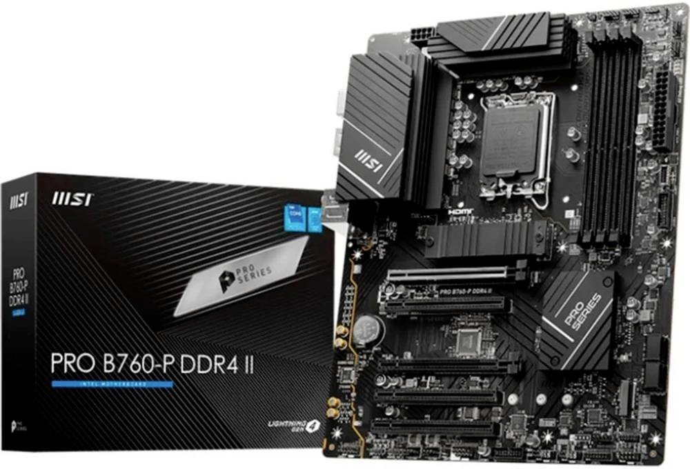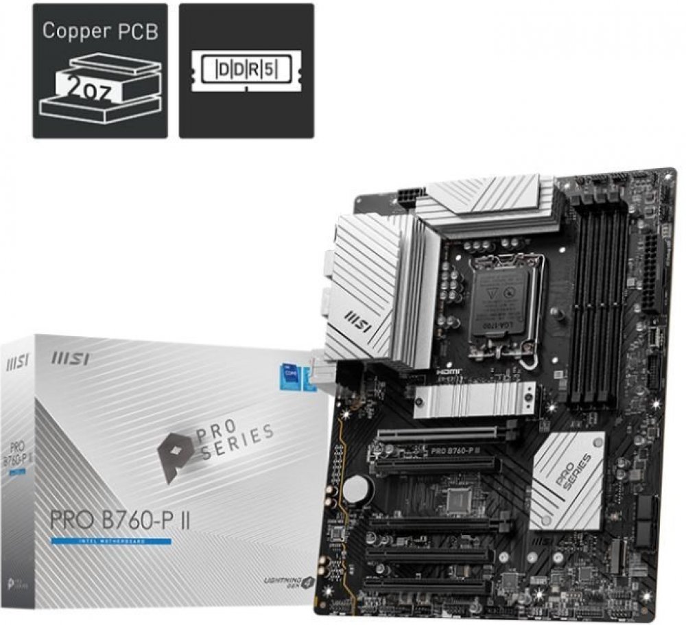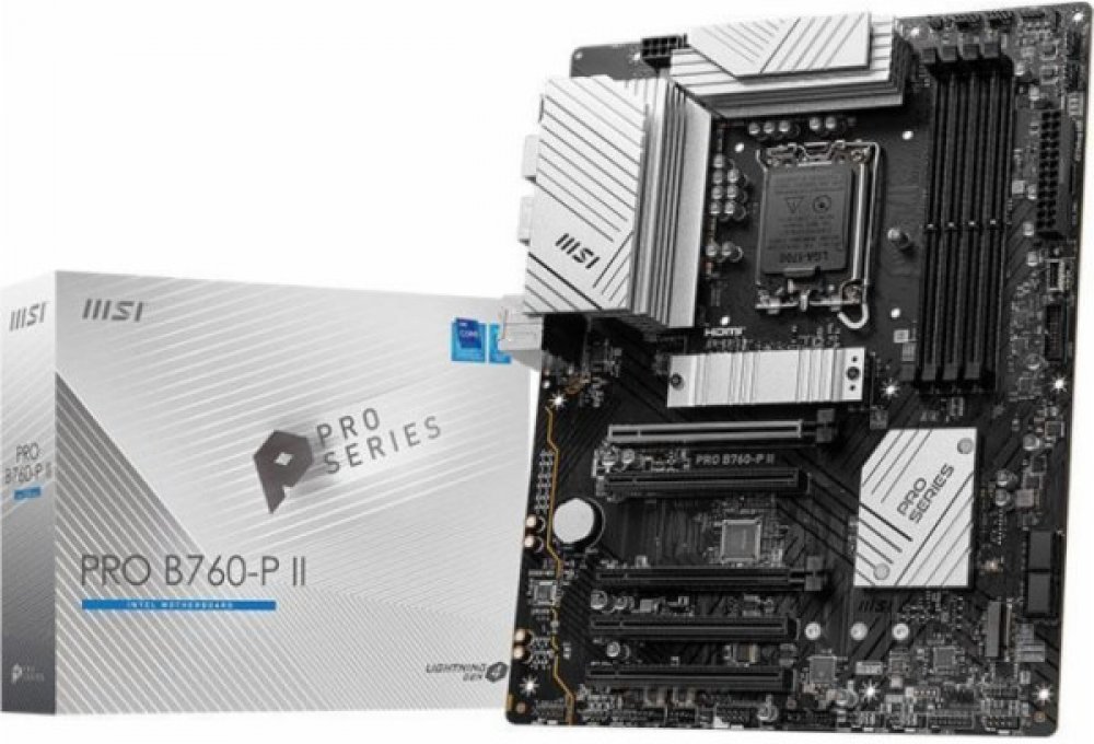 MSI PRO B760-P IIPRO B760-P II is designed with tons of flexible tools with DDR5 memory version.The PRO Series is tailored to professionals from all walks of life. The lineup features impressive performance and high quality, while aiming to provide users incredible experience. Users who care about productivity and efficiency can definitely count on the MSI PRO Series to assist you with multitasking and increasing efficiency.ChipsetINTEL B760CPUSupport Intel® Core™ 14th/ 13th/ 12th Gen Processors, Intel® Pentium® Gold and Celeron® ProcessorsLGA 1700Memory4x DDR5, Maximum Memory Capacity 256GBMemory Support 7000+(OC)/ 6800(OC)/ 6600(OC)/ 6400(OC)/ 6200(OC)/ 6000(OC)/ 5800(OC)/ 5600(JEDEC)/ 5400(JEDEC)/ 5200(JEDEC)/ 5000(JEDEC)/ 4800(JEDEC) MHzMax. overclocking frequency:• 1DPC 1R Max speed up to 7000+ MHz• 1DPC 2R Max speed up to 6400+ MHz• 2DPC 1R Max speed up to 6000+ MHz• 2DPC 2R Max speed up to 5600+ MHzSupports Intel® XMP 3.0 OCSupports Dual-Controller Dual-Channel modeSupports non-ECC, un-buffered memoryOnboard Graphics1x HDMI™Support HDMI™ 2.1, maximum resolution of 4K 60Hz*1x DisplayPortSupport DP 1.4, maximum resolution of 4K 60Hz**Available only on processors featuring integrated graphics. Graphics specifications may vary depending on the CPU installed.Slot5x PCI-E x16 slotPCI_E1 Gen PCIe 4.0 supports up to x16 (From CPU)PCI_E2 Gen PCIe 3.0 supports up to x1 (From Chipset)PCI_E3 Gen PCIe 4.0 supports up to x4 (From Chipset)PCI_E4 Gen PCIe 3.0 supports up to x1 (From Chipset)PCI_E5 Gen PCIe 3.0 supports up to x1 (From Chipset)AudioRealtek® ALC897 Codec7.1-Channel High Definition AudioSupports S/PDIF outputStorage2x M.2M.2_1 Source (From CPU) supports up to PCIe 4.0 x4 , supports 2280/2260/2242 devicesM.2_2 Source (From Chipset) supports up to PCIe 4.0 x4 , supports 2280/2260/2242 devices4x SATA 6GRAIDSupports RAID 0, RAID 1, RAID 5 and RAID 10 for SATA storage devicesUSB2x USB 2.0 (Rear)4x USB 2.0 (Front)2x USB 5Gbps Type A (Rear)4x USB 5Gbps Type A (Front)1x USB 5Gbps Type C (Front)1x USB 10Gbps Type C (Rear)LANRealtek® RTL8125BG 2.5G LANInternal IO1x Power Connector(ATX_PWR)2x Power Connector(CPU_PWR)1x CPU Fan1x Pump Fan5x System Fan2x Front Panel (JFP)1x Chassis Intrusion (JCI)1x Front Audio (JAUD)1x Com Port (JCOM)2x Addressable V2 RGB LED connector (JARGB_V2)2x RGB LED connector(JRGB)1x TPM pin header(Support TPM 2.0)4x USB 2.0 ports4x USB 5Gbps Type A ports1x USB 5Gbps Type C portsLED FEATURE4x EZ Debug LEDBACK PANEL PORTSDisplayPort2.5G LANUSB 2.0Audio ConnectorsHDMI™USB 5Gbps (Type-A)USB 10Gbps (Type-C)S/PDIF-OUTOPERATING SYSTEMSupport for Windows® 11 64-bit, Windows® 10 64-bitFORM FactorATX243.84mmx304.8mm.