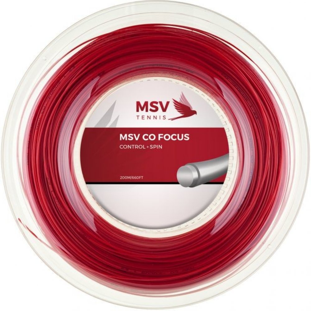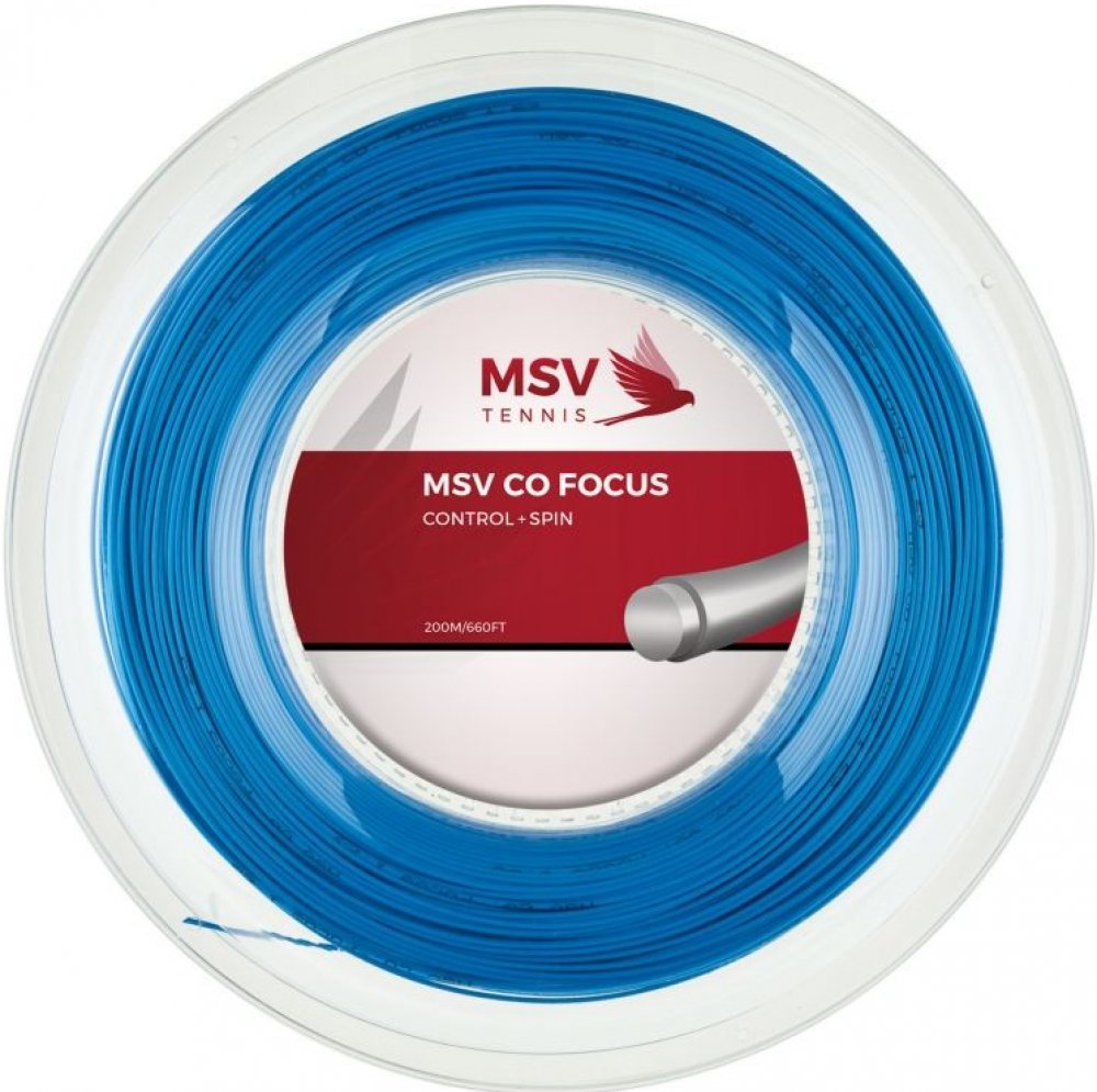 MSV Co. Focus (200 m) - černý Tenisový výplet co-polyesterový, monofilamentový s hladkým průřezem. Jeho výhodami jsou dobrá dynamika, kontrola, cit a udržení napětí. Použitá speciální směs (výplet je měkčí ve srovnání se standardními polyestery), která je výsledkem mnohaletého výzkumu, umožňuje vynikající "hratelnost" tohoto výpletu, což se projevuje velmi vysokým procentem spokojených tenistů (v průzkumech portálu stringforum.net - přibližně 90% spokojených osob, které hrály s tímto výpletem).