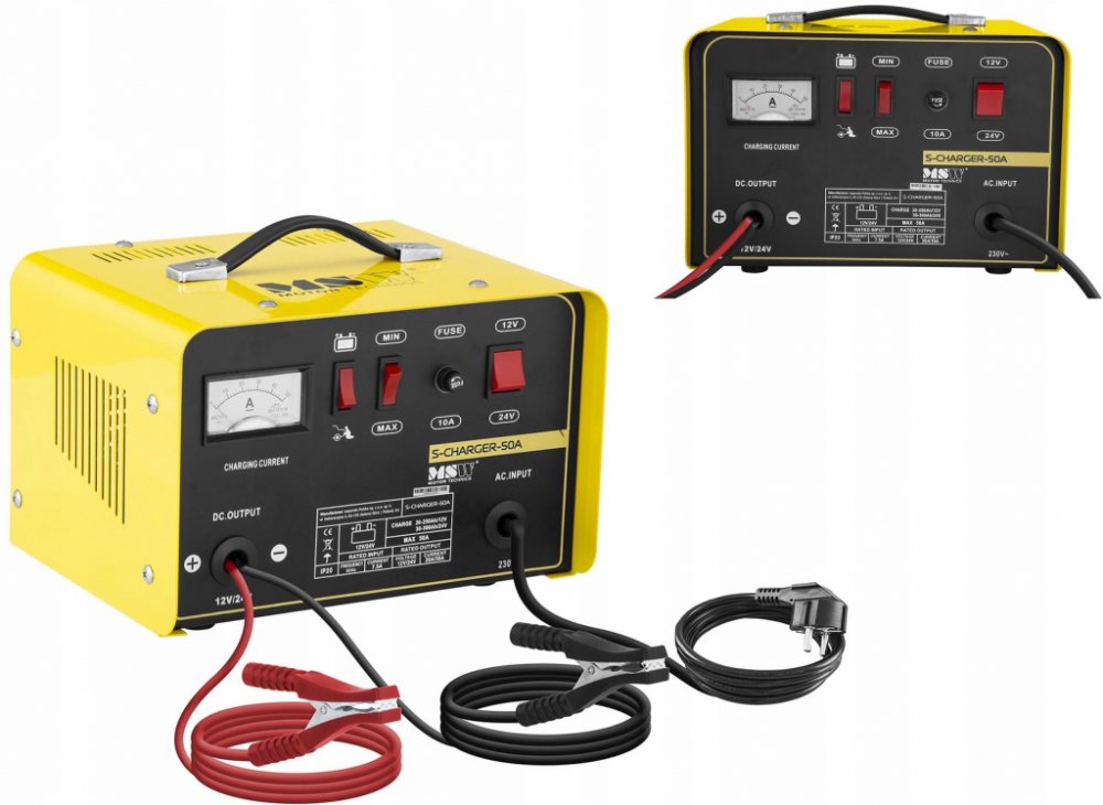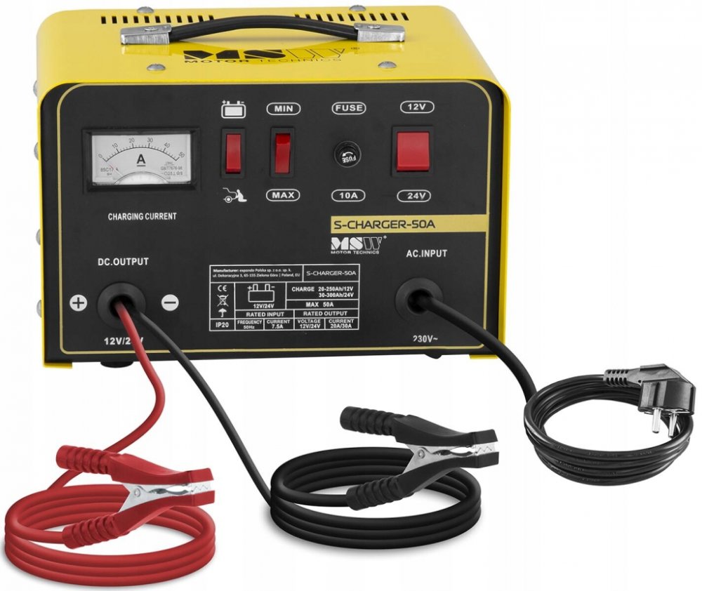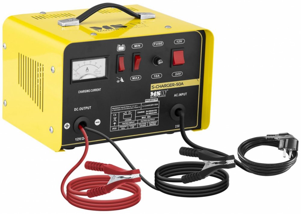 Nabíječka autobaterií - pomoc při startování - 12/24 V - 20/30 A Silný nabíjecí výkon a spolehlivá funkce pomoci při startování – to jsou vlastnostmi nabíječky baterií S-CHARGER-50A výrobce MSW. Nabíječka autobaterií je cenově výhodnou investicí jak v řemesle, tak i v rámci soukromého použití, která se vyplatí po celou dobu životnosti přístroje. Neboť pravidelná údržba výkonu baterie může významně prodloužit dobu užívání akumulátorů. efektivní pomoc při startování u vybitých bateriích intenzita nabíjení přizpůsobená stavu nabití (MIN/MAX) rychlý a spolehlivý nabíjecí výkon až 20 A jednoduchá volba mezi 12 V a 24 V integrované elektrické a nabíjecí kabely analogový displej pro dohled nad procesem nabíjení