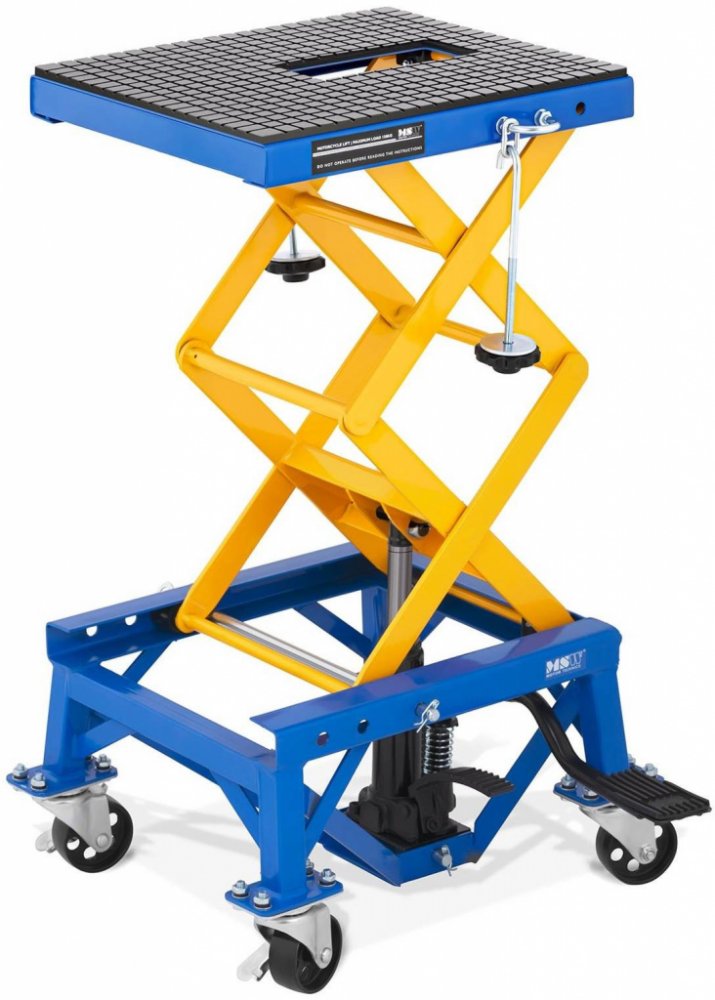 Tato pojízdná nůžková zvedací plošina MSW-MHB-150-PRO s nosností až do 150 kg je vhodná především k nadzvedávání a přidržení motocyklů, jako jsou např. motorky na motokros, skútry nebo motorky enduro. Především je vhodná do servisů, kde se opravují motocykly, automobily a do ostatních opravárenských dílen. Mobilní zvedací plošina má plochu 41 x 35 cm a nabízí dostatečný prostor i pro uložení Vašeho nářadí, která tak máte vždy po ruce. Bezpečné ustavení zajišťují čtyři ocelové patky, které jsou vybaveny kolečky s brzdou. Pomocí upínacích popruhů upevníte motorku do ok ve tvaru písmene U a pomocí zvedacího zařízení ji zvednete do požadované pracovní výšky. Díky kolečkům je možné používat pojízdnou zvedací plošinu velice flexibilně a pohodlně ji přepravovat na libovolné místo. Zvedací zařízení je možné pohodlně obsluhovat pedálem a plošinu je tak možné pohodlně zvednout do výšky 35–87 cm. Při provádění údržby či oprav je možné pohodlně dosáhnout i do oblasti pod motorkou. Při rovnoměrném spouštění zvedací plošiny aktivujete nožní pedál a jednoduše vypustíte vzduch ze zvedacího zařízení. Díky své jednoduché manipulaci a kompaktní konstrukci je možné ji používat i ke zvedání jiných předmětů do celkové hmotnosti 150 kg.