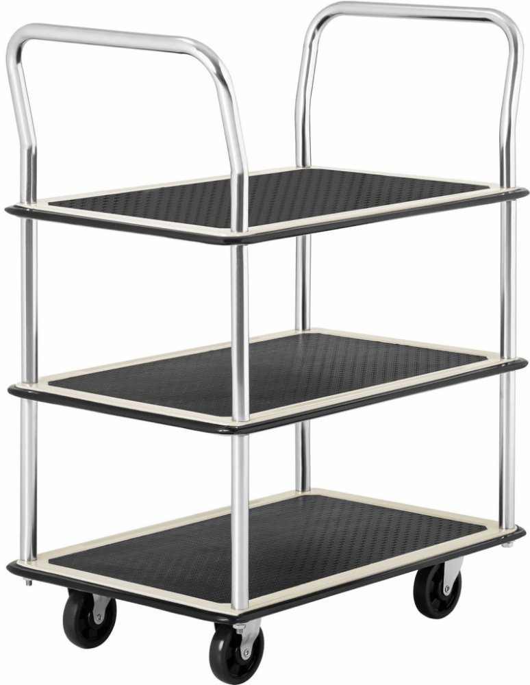 Tři úrovně 72 x 43 cm unesou celkovou hmotnost až 150 kg. Dvě rukojeti, které jsou vysoké 95 cm včetně vozíku, jsou ergonomicky tvarované a skloněné k uživateli, aby byla přeprava co nejpohodlnější. Protiskluzové podložky zajišťují bezpečnost nákladu a zabraňují sklouznutí z vozíku.