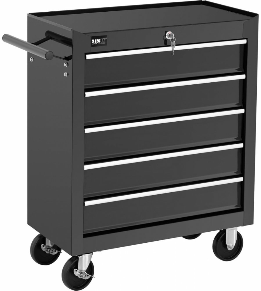 Čistota & bezpečnost! Vozík na nářadí s pěti zásuvkami Pokud potřebujete někam umístit například šroubové klíče, kladiva, kleště, sekáče nebo dláta: Robustní vozík na nářadí MSW-WWG-12 od společnosti MSW, která je představitelem vysoce kvalitní výbavy dílen, uloží vaše pracovní pomůcky v čistém a bezpečném prostředí. Vozík je vybaven pěti uzamykatelnými zásuvkami, které chrání svůj obsah před nepovolaným přístupem. Tento užitečný pomocník při udržování pořádku by neměl chybět v žádném auto-servisu, truhlářství a samozřejmě ani u žádného kutila v jeho soukromé sklepní dílně! zatížitelné - vozík na nářadí s celkovou nosností až do 50 kg velký úložný prostor – pět zásuvek o velikosti každé 51 x 28 cm plus jedna velká odkládací plocha 61 x 32,5 cm bezpečné - uzamykatelné proti neoprávněnému přístupu a pro zajištění během přepravy s ochranou - silikonové podložky chrání obsah před sklouznutím a zabraňují poškrabání povrchu mobilní - snadný přesun a ovládání díky čtyřem kolečkům a širokému úchytu