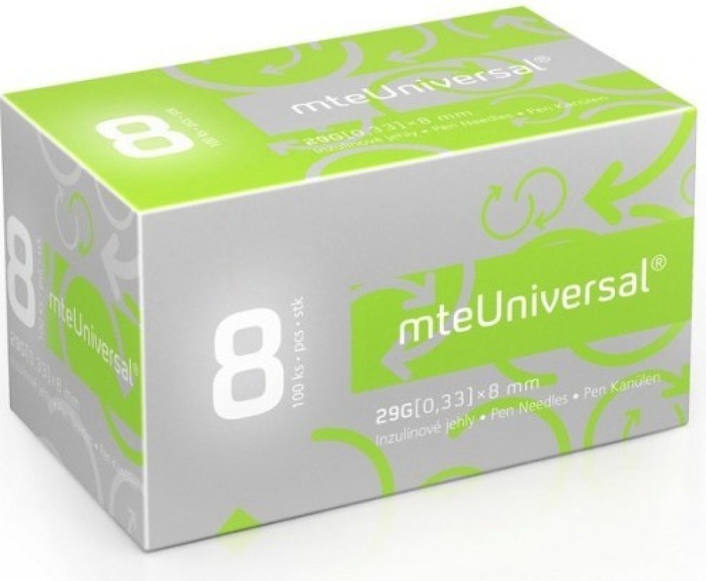 Jehly MTE Universal jsou technologickým výrobkem nové generace určeným pro aplikaci inzulínu prostřednictvím inzulínových per. Speciální konstrukce závitu jehel MTE Universal v kombinaci s ochranným víčkem umožňuje snadné a bezpečné nasazení jehličky na všechny běžně používané typy inzulínových per. Silikonová povrchová vrstva jehličky spolu s atraumaticky hladkou fasetou zajišťuje téměř nevnímatelný vpich. Inzulínové jehly MTE Universal jsou vyráběny v Německu a splňují nejpřísnější kriteria legislativy SRN, ČR a EU. Svojí kvalitou se řadí mezi nejlepší inzulínové jehly na světovém trhu.