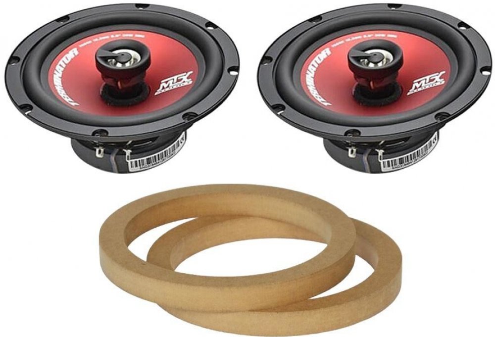 Ohm 1 pár koaxiálních reproduktorů MTX Audio TR65C (2x středobas s výškovým reproduktorem uprostřed) Ohm 1 pár MDF podložek přesně pro Volkswagen T-Roc z roku 2017 zadních dveří (2ks MDF podložek)