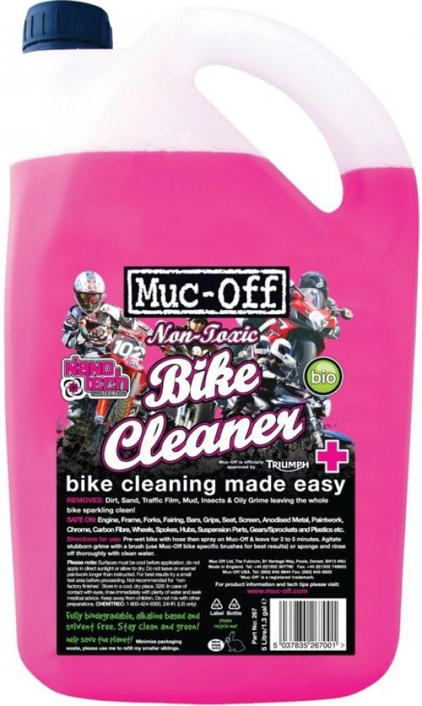 Muc-Off Moto Cleaner je zásaditý a jelikož neobsahuje žádné kyseliny ani rozpouštědla, lze ho bezpečně použít k mytí všech materiálů, z kterých jsou dnes vyráběny moderní motocykly. Navíc ho není třeba žádným způsobem ředit nebo jinak před aplikaci připravovat. Tím se jeho použití stává skutečně velice snadným a rychlým!Bike Cleaner je moderní čisticí prostředek, který představuje skutečnou revoluci v oblasti profesionální chemie. Jeho snadné, rychlé a bezpečné použití je založeno na nano částicích, které díky své minimální velikosti dokážou snadno a rychle pronikat špínou a z povrchu ji odstraňovat již na molekulární úrovni.