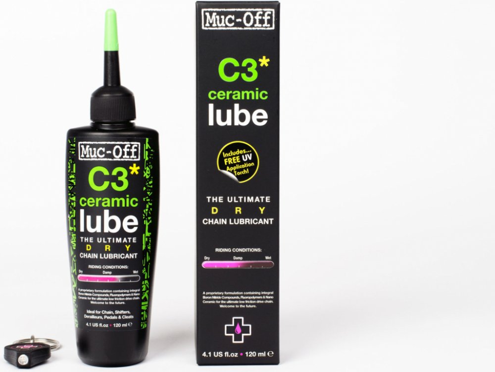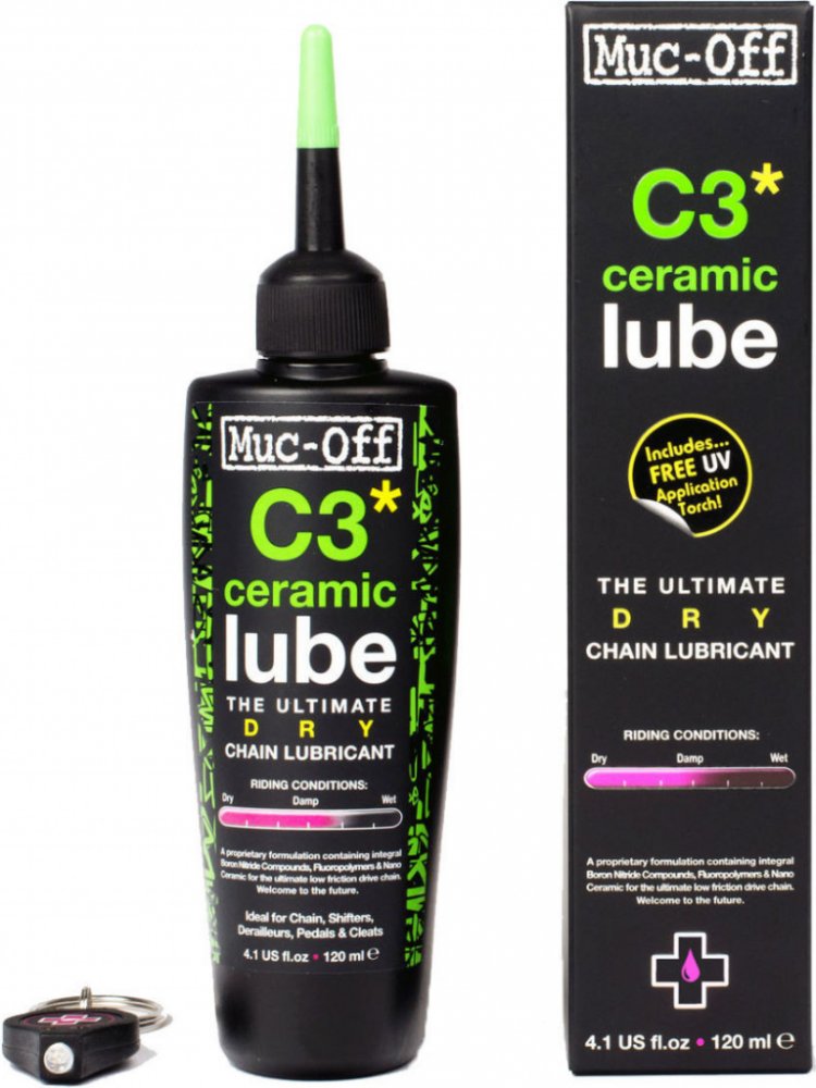 C3 Lube Dry 50 ml.Muc-Off C3 Ceramic Lube je mazivo, které vás uvádí do budoucnosti. Jeho patentované složení dosahuje neuvěřitelného poměru odolnosti a velmi nízkého tření. Sloučenina nitridu boritého má totiž strukturu grafitu a společně s diamantem patří v současné době k nejtvrdším známým látkám. Odolnost C3 je dále vylepšena fluoropolymery.Specifikace Muc Off C3 Ceramic Lube Dry 120ml patentované složení založené na sloučenině nitridu boru, fluoropolymerech a nano keramických aditivech zajišťujících velmi nízkou frikci jedinečné integrované UV fluoreskující barvivo pro skutečně dokonalou kontrolu aplikace maziva C3 vytváří na řetězu suchý keramický povlak zvyšující výkon a odolnost maziva za suchých klimatických podmínek výborně eliminuje ulpívání prachu a jiných nečistot bezpečný k karbonu i jiným citlivým materiálům mazivo není založeno na ropném základu neobsahuje kyseliny ani rozpouštědla plně biologicky odbouratelný dodáváno společně s UV svítilnou určen pro použití na řetězy silničních, cyklokrosových a MTB kol i DH speciálů C3 Lube Dry 50ml.Muc-Off C3 Ceramic Lube je mazivo, které vás uvádí do budoucnosti. Jeho patentované složení dosahuje neuvěřitelného poměru odolnosti a velmi nízkého tření. Sloučenina nitridu boritého má totiž strukturu grafitu a společně s diamantem patří v současné době k nejtvrdším známým látkám. Odolnost C3 je dále vylepšena fluoropolymery.