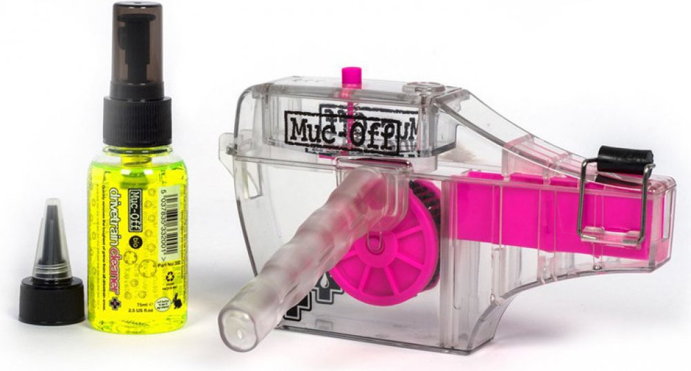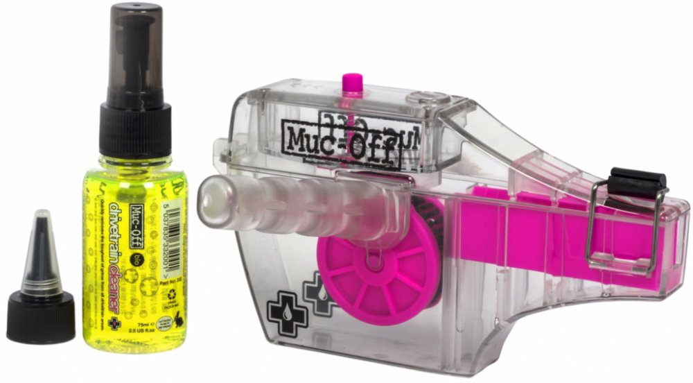 Součástí sady je navíc 75ml balení Muc-Off Dirvetrain Cleaner. Tento přípravek můžete pomocí rozprašovače aplikovat přímo na řetěz nebo ho nalít do horní části nádobky čistícího mechanismu a dávkovat ho podle potřeby pomocí tlačítka pro aplikaci.