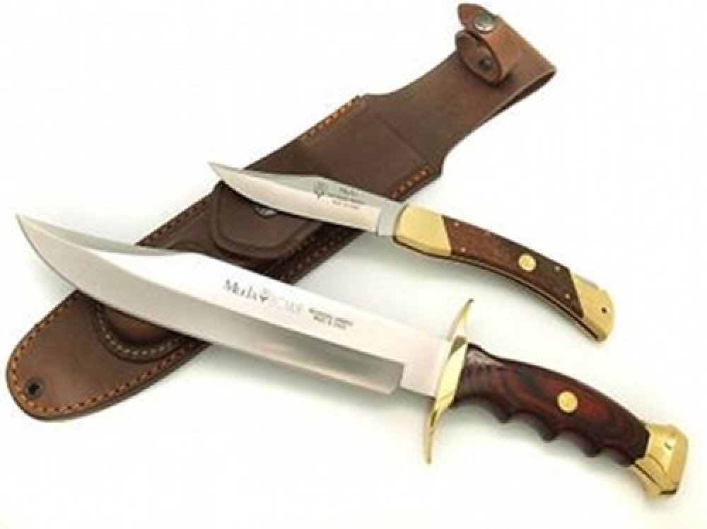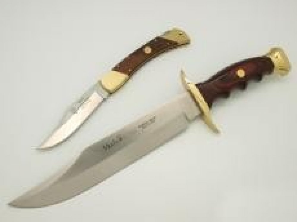 Praktická sada nožů španělské firmy Muela Manufacturas. Zavírací nůž a lovecký nůž v koženém pouzdře.