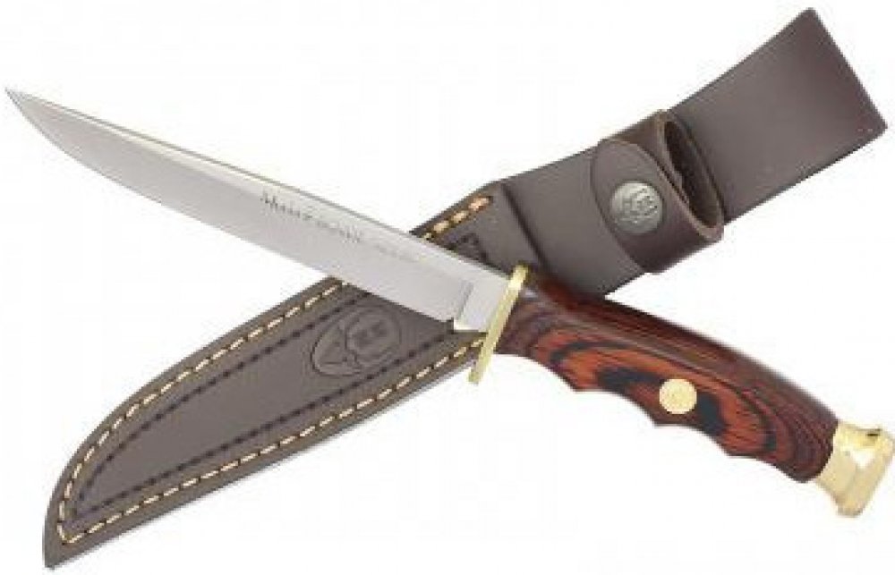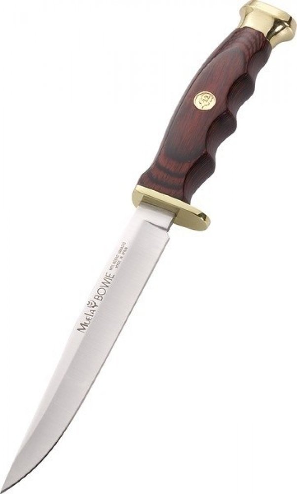 Štíhlý lovecký, lovecký i Bushcraft nůž Muela BWF-14 tzv. zavázák s pevnou čepelí s hladkou hranou z molybden-vanadové oceli. S mosaznou patkou a záštitou. Rukojeť je z odolného a tvrdého dřeva Pakka. Dodává se s hnědým koženým pouzdrem.