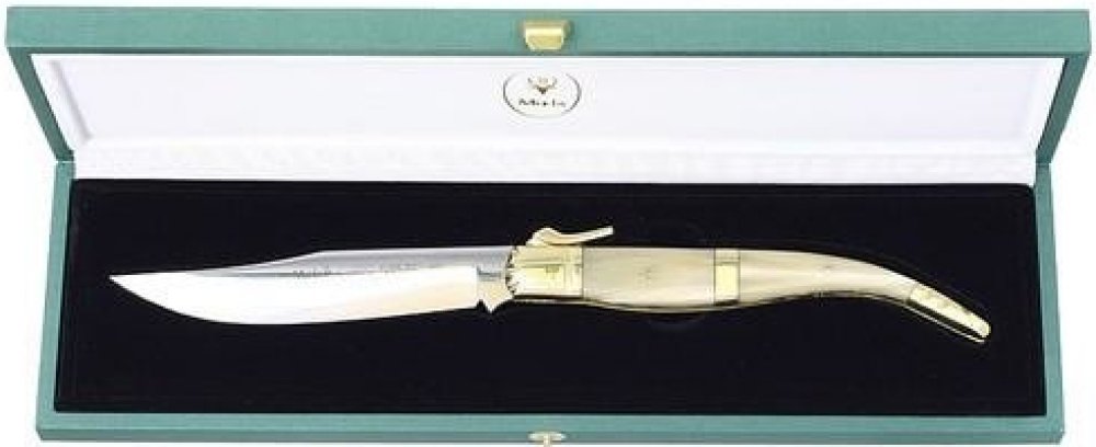Krásný velký zavírací nůž Muela Curro T v klasickém španělském stylu, střenky z rohoviny, baskická pojistka, dárkový box.