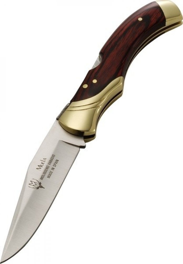 Zavírací lovecký nůž s robustní konstrukcí. Kování a patka rukojeti jsou mosazné, střenky jsou vyrobeny ze dřeva Pakka s nádhernou červeně hnědou kresbou. Čepel je z kvalitní oceli. Bezpečnost zajišťuje zádová pojistka s plastikou mušky na její hlavici.
