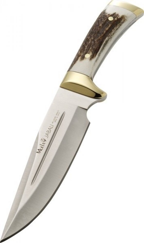 Nádherný integrální nůž Muela Jabali 17 A s mosazným kováním a patkou rukojeti, střenkami z parohu a koženým pouzdrem.