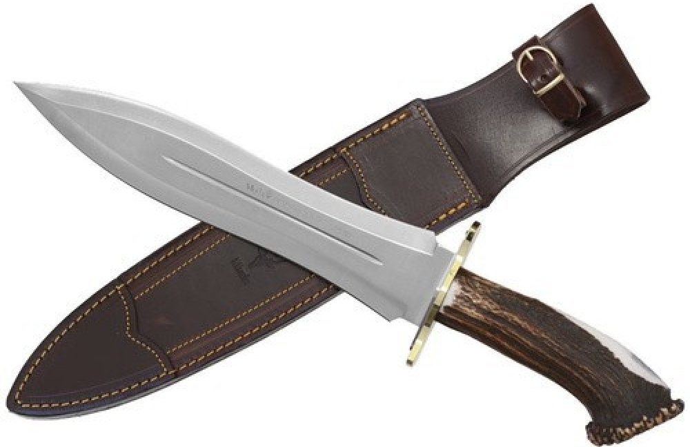 Krásný velký lovecký nůž Muela Podenquero S, oboustranně broušená čepel, mohutná záštita, rukojeť z jeleního parohu zakončená růžicí, dodáván s koženým pouzdrem.