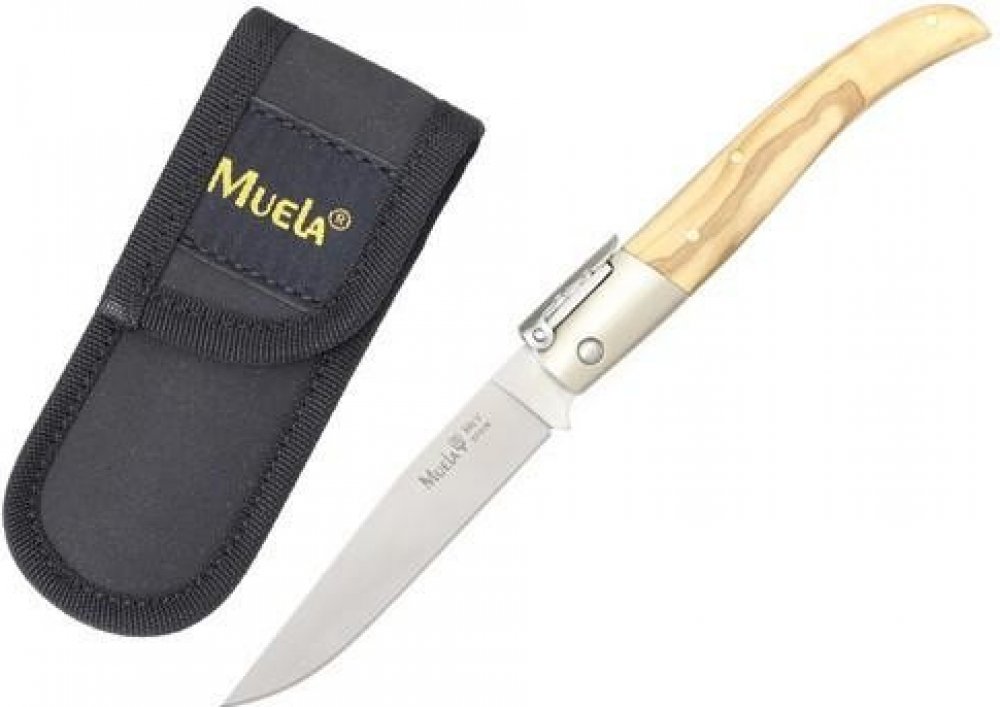 Krásný štíhlý zavírací nůž Muela PQ 9 OL, s alpakovým kováním, střenkami z olivového dřeva, pojistkou a nylonovým pouzdrem.