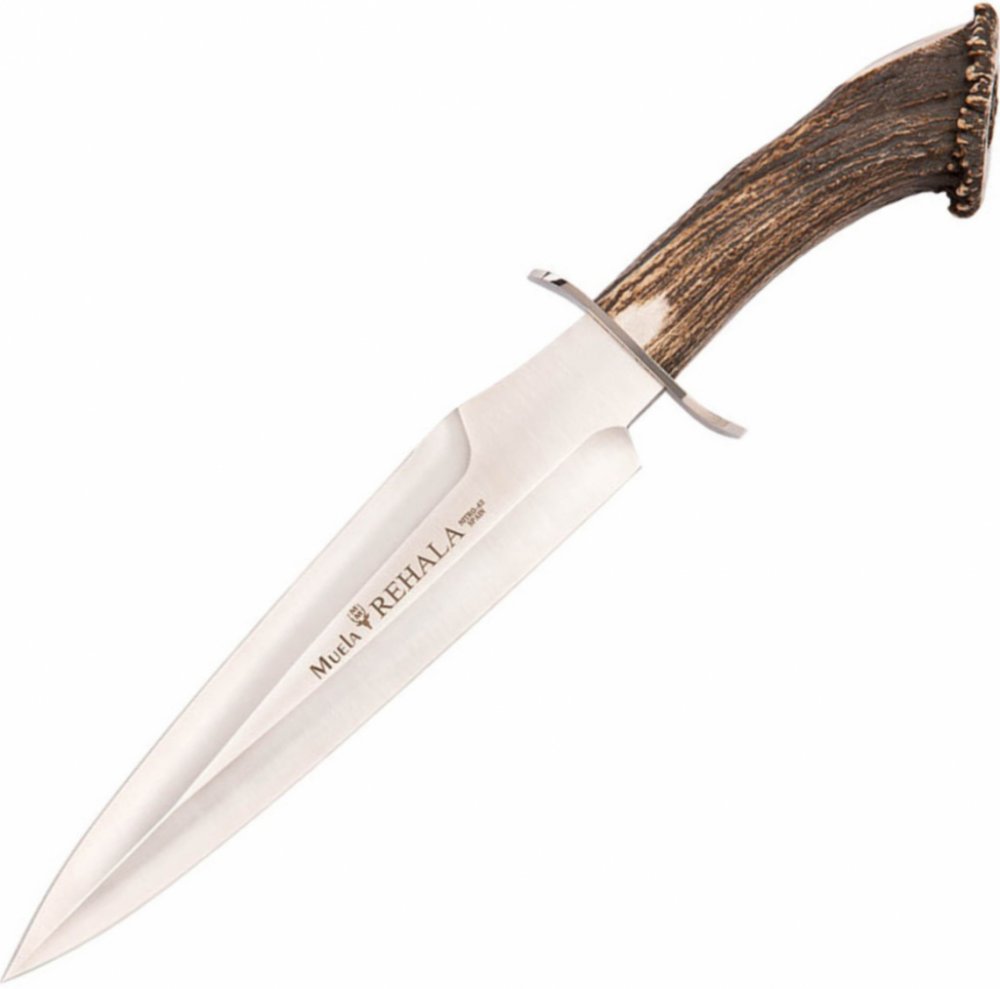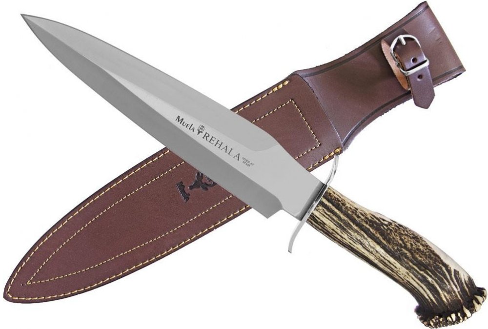 Velký lovecký nůž Muela Rehala 27 S, oboustranně broušená čepel, rukojeť z jeleního parohu zakončená růžicí, oboustranná záštita, kožené pouzdro.