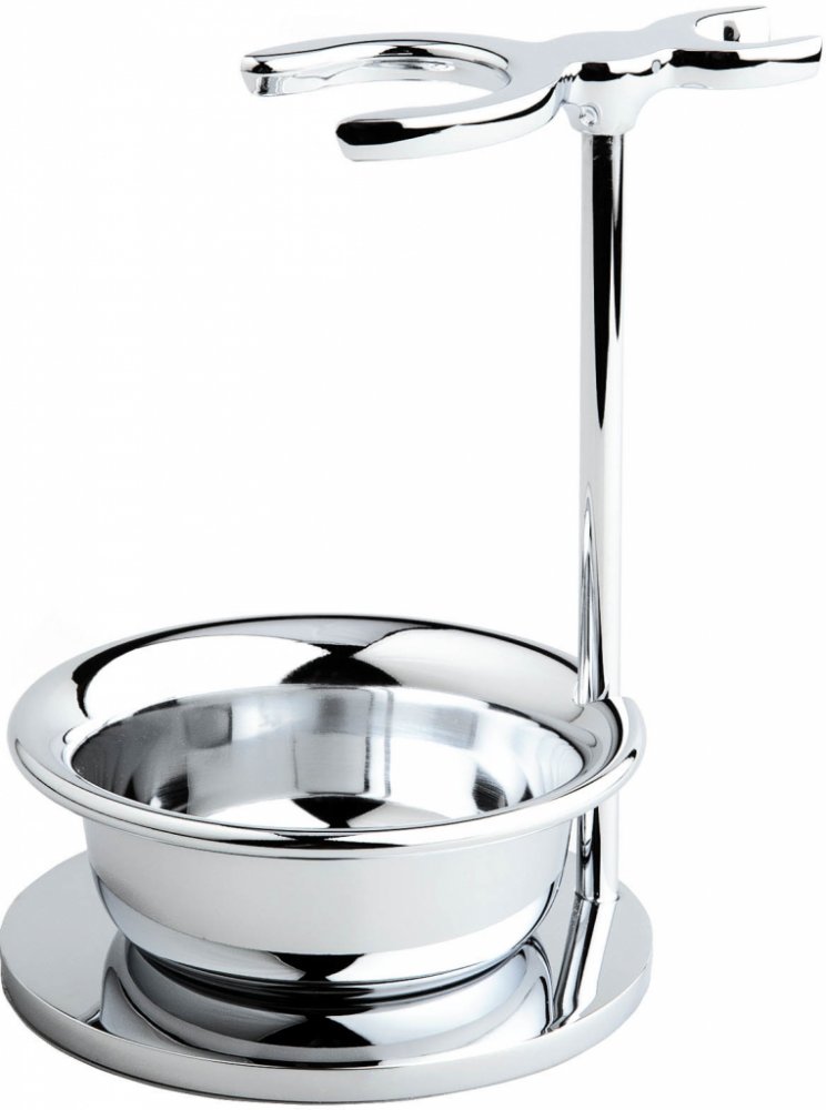 Někdy mít vše po ruce může být velmi užitečné. Tento stojánek na holicí strojek a štětku s miskou disponuje moderním designem a je vyroben z kvalitní chromované mosazi, což přináší mnoho výhod. Je velmi stabilní a díky oddělitelné misce na pěnu je snadné vytvořit hustou pěnu pro váš holicí rituál.Výška 130 mm.Průměr otvoru na štětku 29 mm.Průměr otvoru na strojek 14 mm.Vnější průměr misky 87 mm. Vnitřní průměr misky 70 mm.Vhodný pro většinu typů štětek v naší nabídce - pro ujištění nás kontaktujte a my vyzkoušíme, zda-li vámi vybraná štětka do stojánku pasuje.Vyrobeno v Německu.