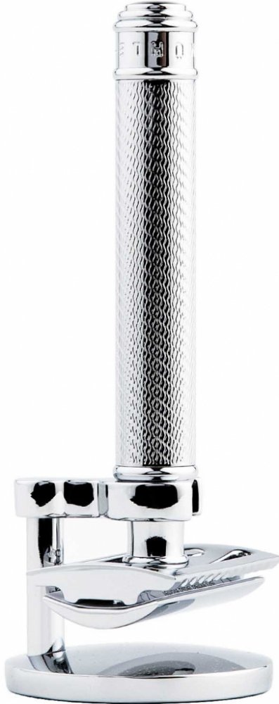 Součástí sady je i chromovaný stojánek RHM SR, vyrobený z mosazi a ošetřený odolnou lesklou úpravou. Stojánek je zespodu opatřen měkkou filcovou podložkou, která zajišťuje stabilitu a zabraňuje klouzání po hladkém povrchu. Strojek v něm drží zavěšený hlavou dolů, což umožňuje rychlé vyschnutí a udržení hygieny i delší životnosti žiletky.