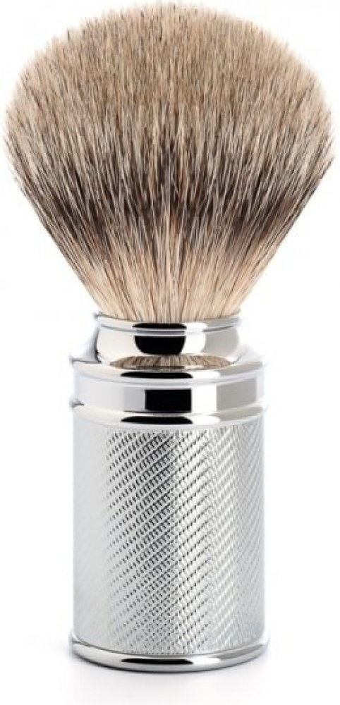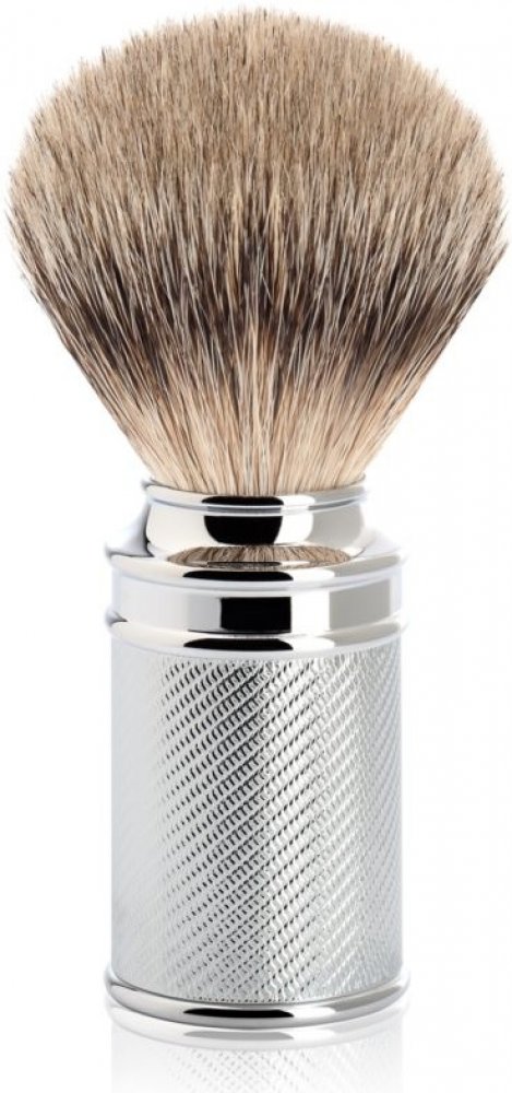 Štětka na holení z nejkvalitnějších a tím pádem nejjemnějších jezevčích štětin kvality silvertip. Nejkvalitnější proto, že jich na sobě jezevec má jenom málo, jen na několika místech. Průměr štětky je M. Takže ani obří královská, ani malá cestovní, něco mezi. Rukojeť je kovová, pochromovaná, elegantně jednoduchá.