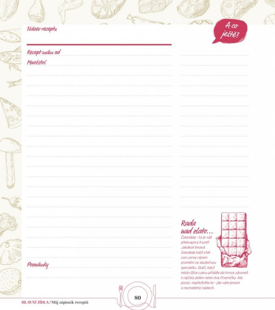 Zapište si recept na nejúžasnější vánoční cukroví, maminčinu neodolatelnou sekanou, vláčnou bábovku od tetičky nebo nezapomenutelné těstoviny od kamarádky z Itálie! Poznamenejte si, proč je právě tenhle recept nejlepší, od koho jste ho vyprosili, čím je pro vás výjimečný nebo jak a čím jste ho vylepšili. Nakonec můžete do zápisníku nalepit fotku uvařeného jídla, ale třeba i vystřiženou předlohu z časopisu, obrázek babičky, od níž máte recept, nebo snímek přátel, s nimiž či pro něž jste jídlo uvařili.