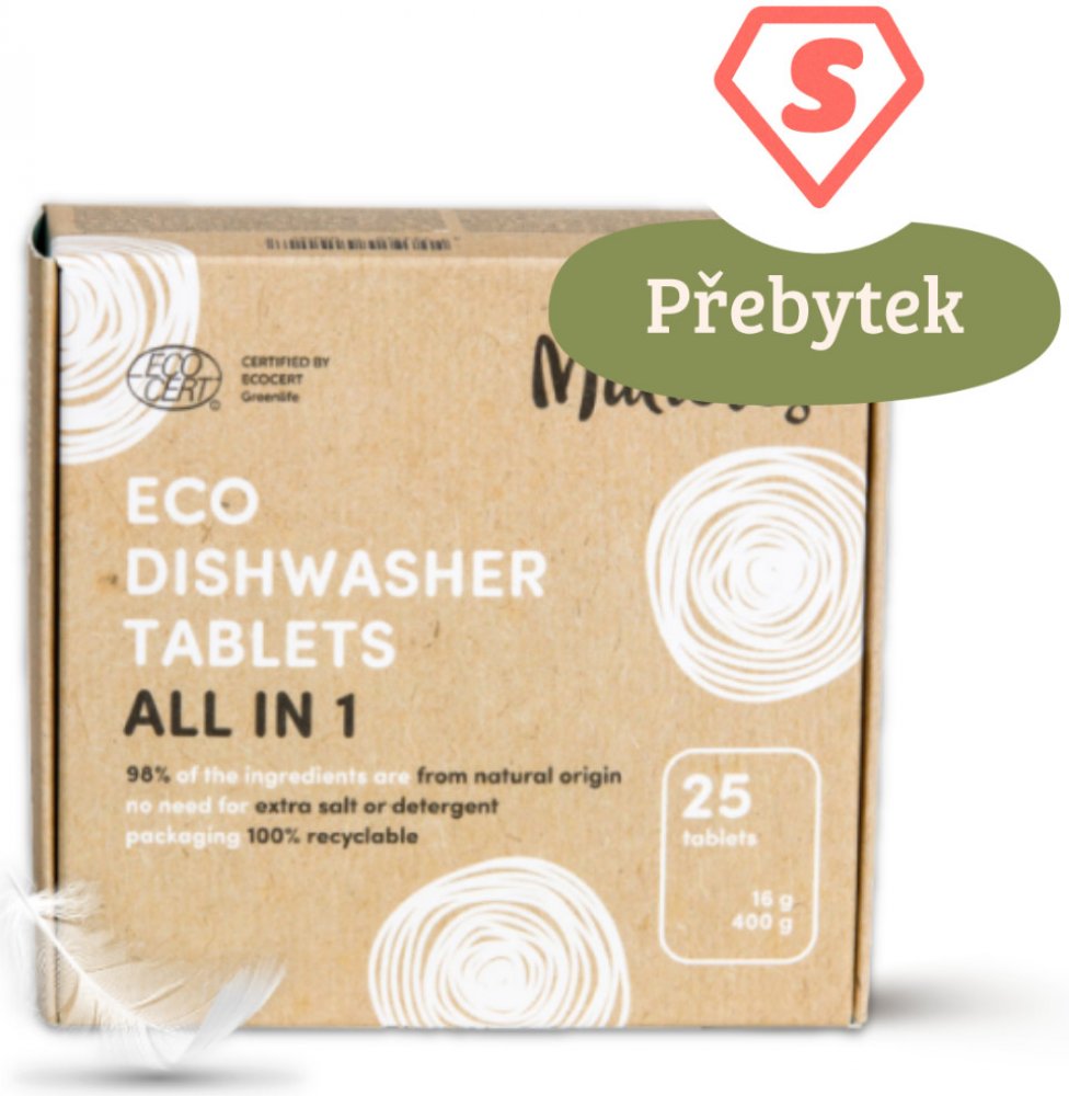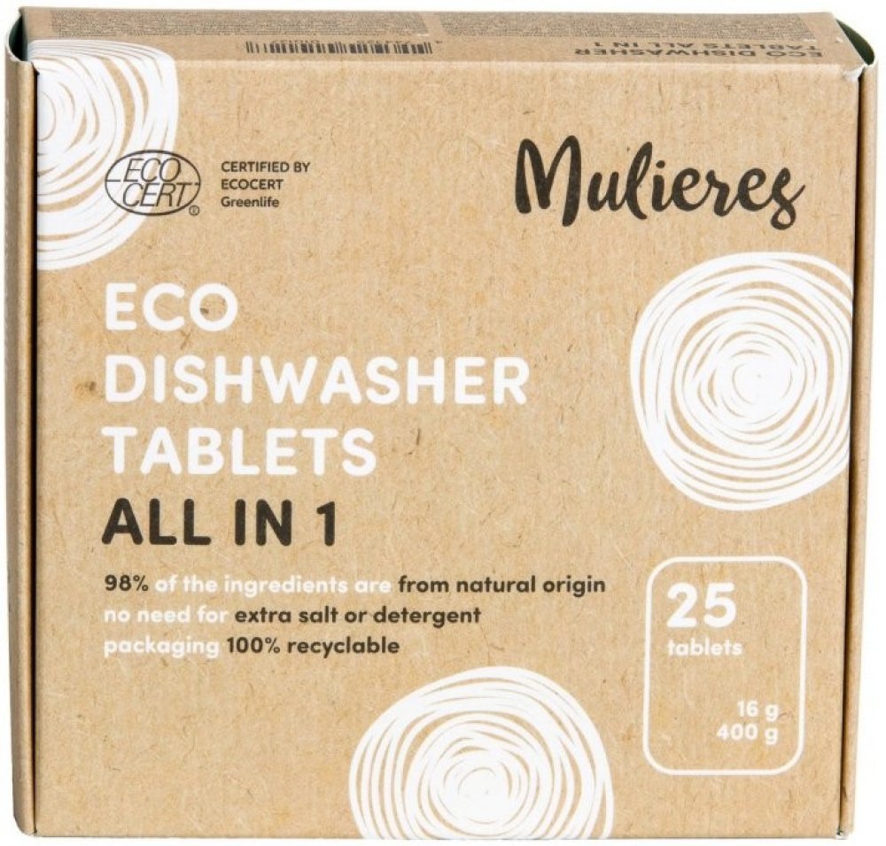 Mulieres 25 ks tablety Mulieres pro silné znečištění a mastnotu vhodné pro krátké programy all-in-one bez vůně 0.5 kg bez fosfátů, 98 % přírodních složek