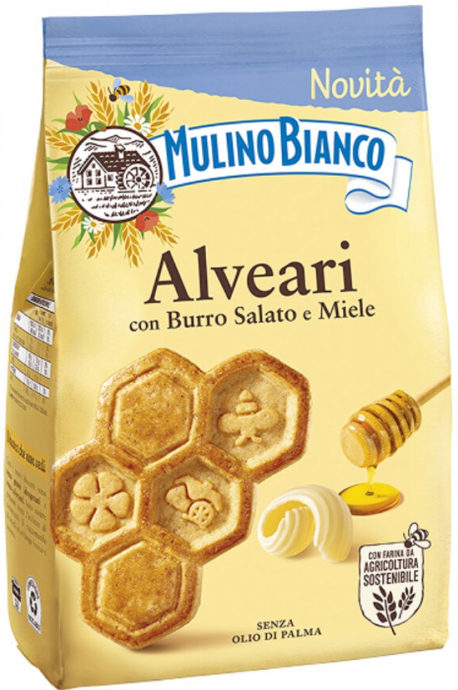 Alveari jsou nové frollini od Mulino Bianco, vytvořené z jemného těsta obohaceného o slaný máslový tuk a med, které dodávají kontrast jemnosti a pikantní rovnováhy. Každé sousto je pozvánkou do světa italské snídaně: vůně pečení, lehká strukturou, křupavost i sladko-slaný efekt, který v chuti zůstává. Díky tomu jsou vhodné jak samostatně ke kávě či čaji, tak i jako základ pro dezerty nebo doplněk k džemům či čokoládě. Produkt je zároveň bez palmového oleje, bez umělých barviv a bez konzervantů.