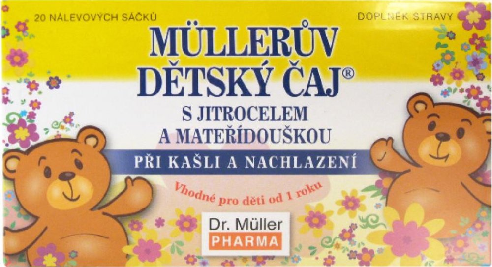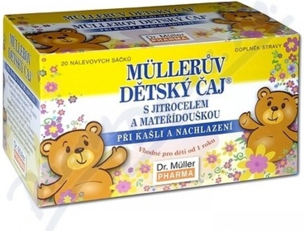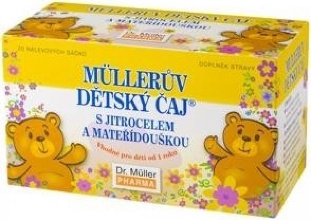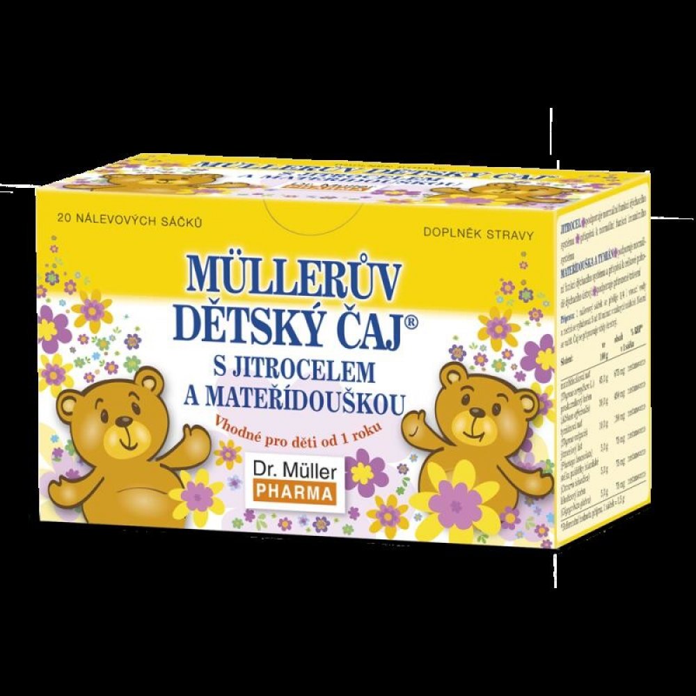 Müllerův dětský čaj® s jitrocelem a mateřídouškou Na základě vyjádření Pediatrické společnosti České lékařské společnosti je přípravek vhodný pro děti od 1 roku. JITROCEL • má zklidňující účinky na krk, hltan a hlasivky • ulevuje při škrábání v krku MATEŘÍDOUŠKA • usnadňuje vykašlávání • pomáhá při suchém kašli • ulevuje při škrábání v krku • přispívá k celkové pohodě dýchacího ústrojí Balení : 20...