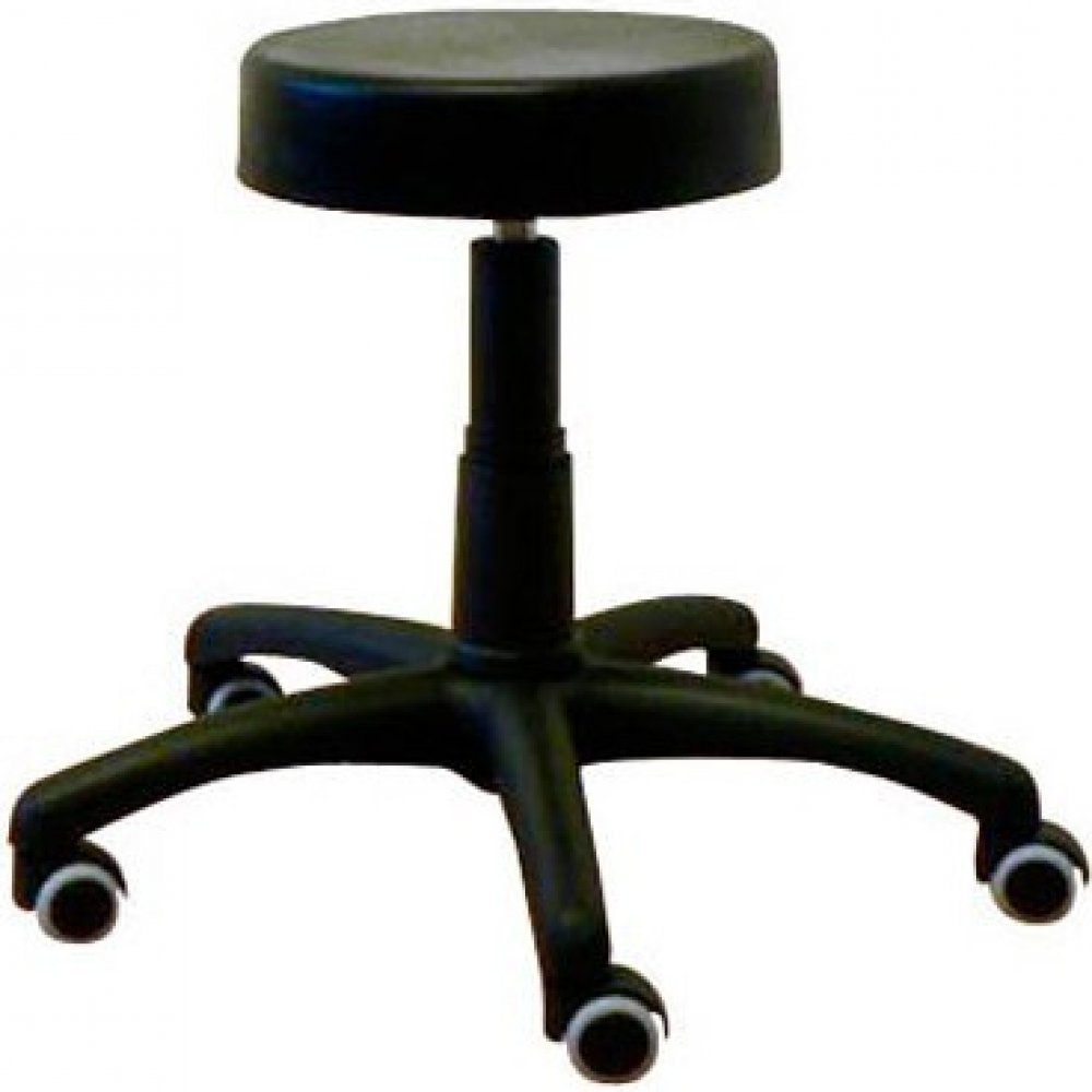 Dílenské otočné židle, sedák z měkčeného polyuretanu.Popis: Výškové nastavení pomocí plynového pístu. Plastový černý kříž s měkkými kolečky nebo kluzáky.