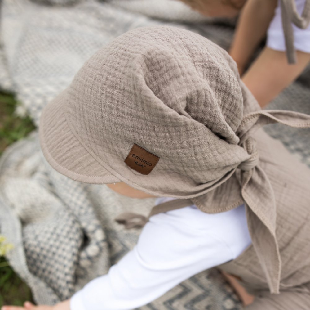 Stylový kšilt o délce 18 cm poskytuje praktické zastínění obličeje, aniž by omezoval výhled nebo pohyb. Zavazování na kličku je jednoduché, bezpečné a přizpůsobí se každé hlavičce – šátek tak skvěle sedí dětem od 6 měsíců až přibližně do 5 let. Díky univerzálnímu střihu ho s radostí nosí holčičky i kluci.Šátek je ušitý z jemného mušelínu – tkaniny ze dvou vrstev spojených neviditelnými stehy. To mu dodává nejen krásnou texturu a hebkost, ale i potřebnou pevnost a dlouhou životnost. Mušelín je neprůsvitný, měkký a hypoalergenní, takže je ideální i pro tu nejcitlivější dětskou pokožku.
