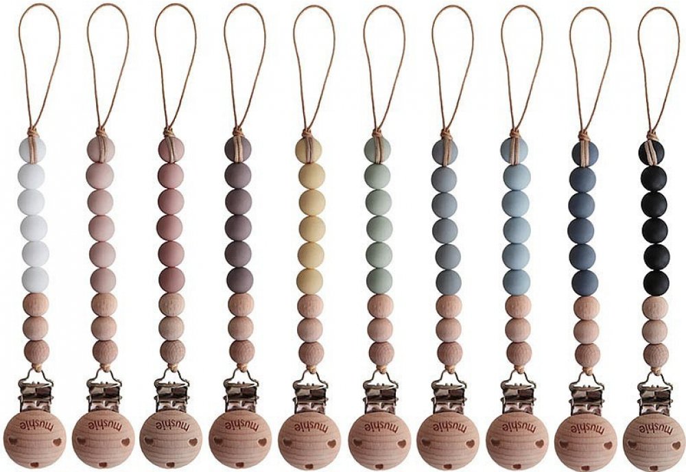 Klipy na dudlíky od značky Mushie, to je láska na první pohled. Důvodem je citlivě zkombinované dřevo se silikonovými korálky v jemných elegantních vintage barvách. Ty jsou vybírány velmi pečlivě a celý design se podřizuje heslu „jednoduchost”.