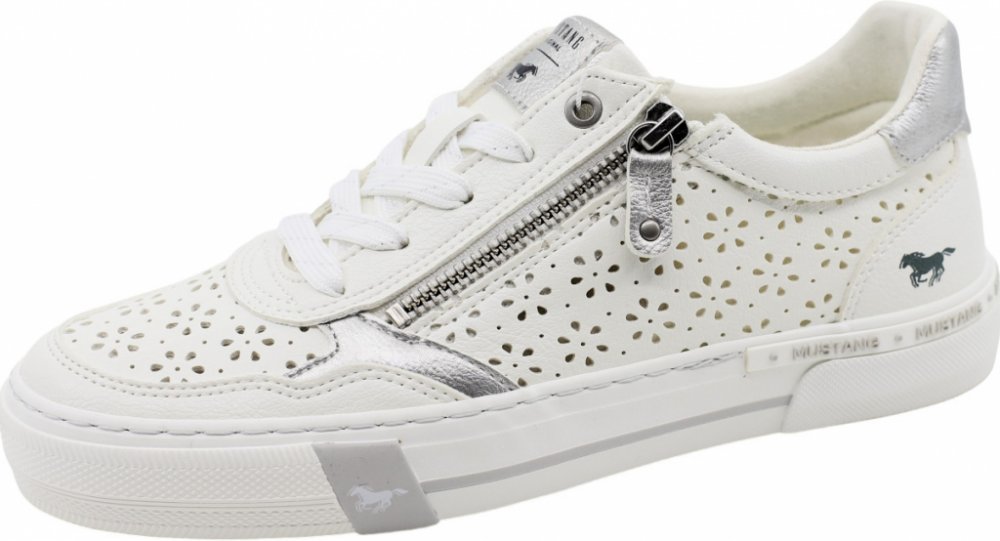Právě jste našli klasickou tenisku MUSTANG ve bílé barvě s jemnou perforací ve tvaru kytiček. Tento model tenisek je vhodný pro celodenní nošení, nejvíce je ale užijete v létě. Velice slušivý model. Zavazování na tkaničky + funkční zip. Univerzální barva, která se bude hodit ke každému oblečení. Stříbrné detaily. Tkaničky se třpytivou nitkou.