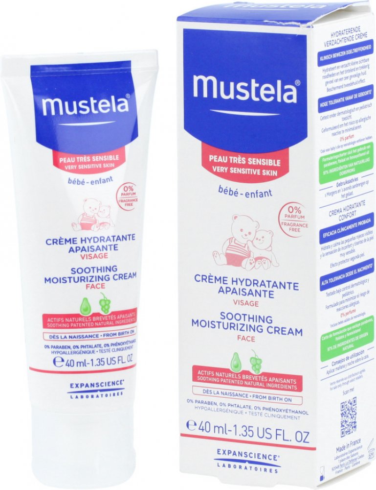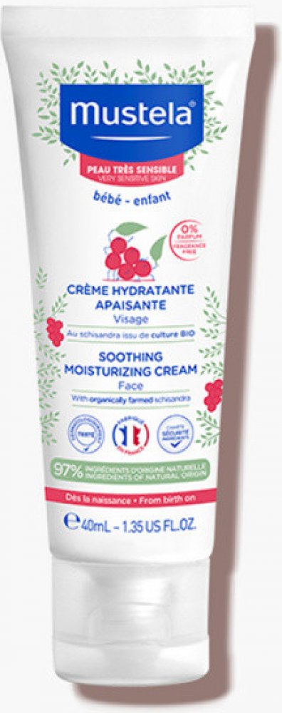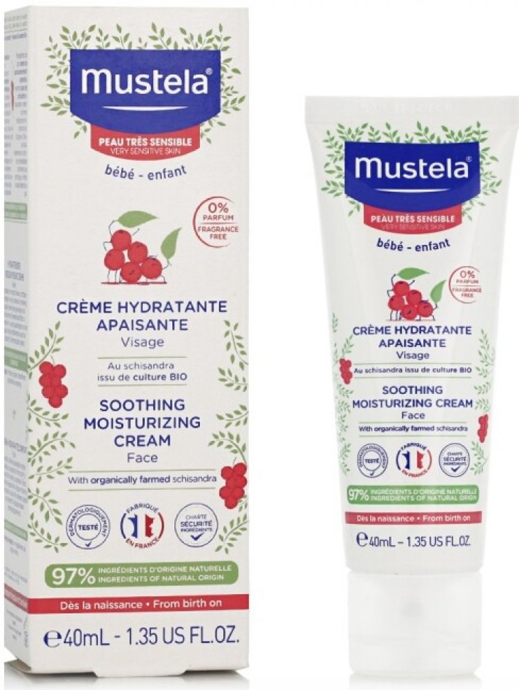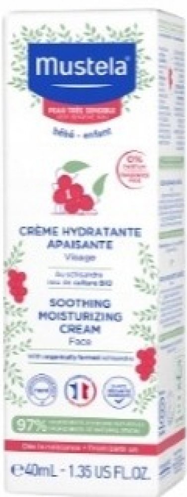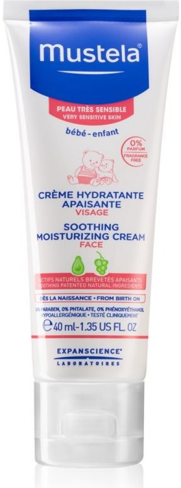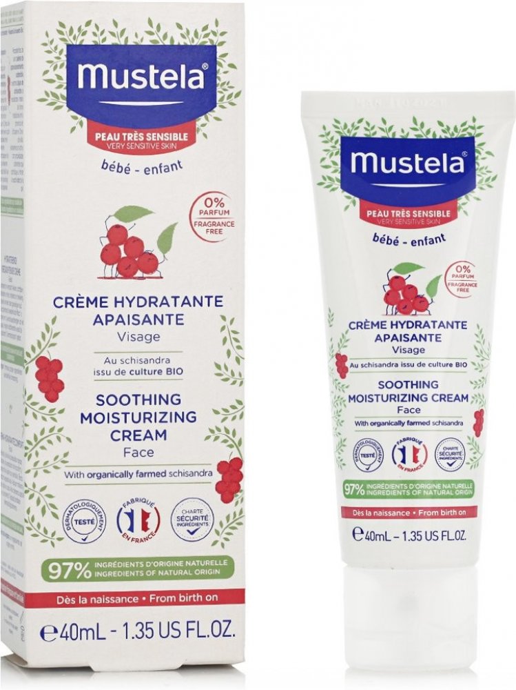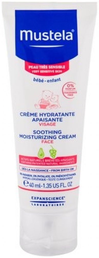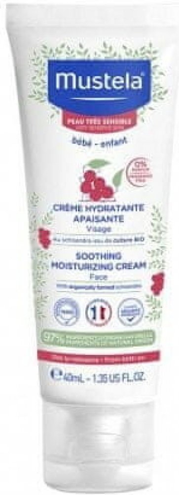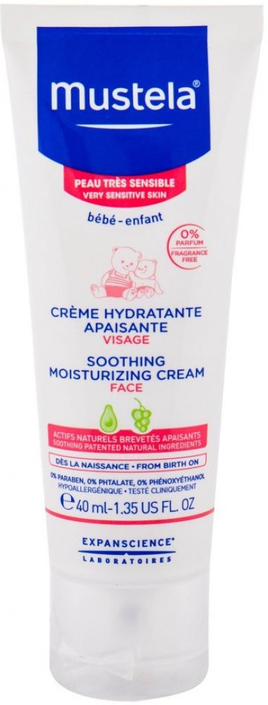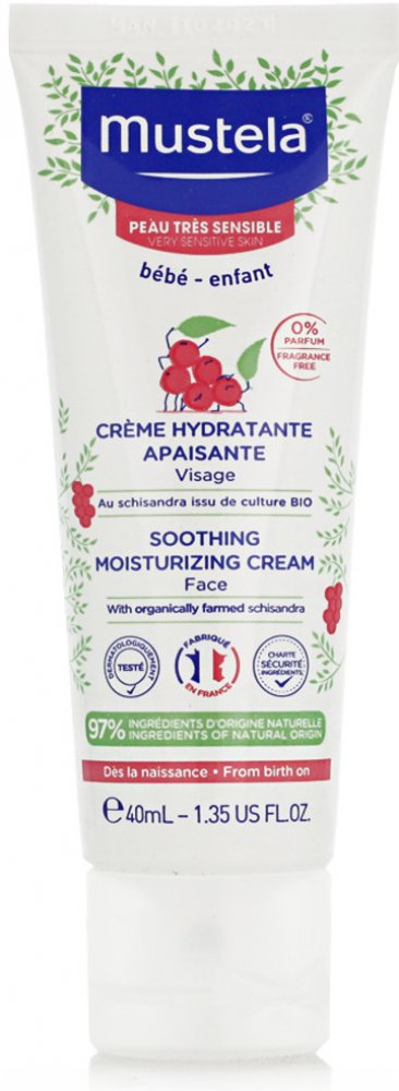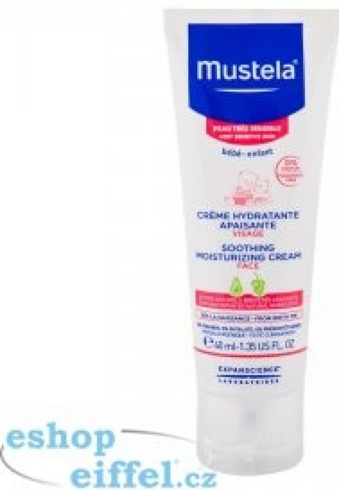 Mustela Zklidňující hydratační krém pro děti 40ml Mustela Soothing Moisturising Cream je zklidňující hydratační krém pro děti a novorozence. Je vhodný zejména pro citlivou a zranitelnou pokožku a byl vyvinut pro šetrnou péči o pokožku obličeje novorozenců (včetně nedonošených dětí mimo novorozenecké oddělení), kojenců a dětí. Speciální přípravek je velmi jemný, šetrný k citlivé pokožce nejmenších a nezpůsobuje žádné nepříjemné pocity, pnutí, štípání ani pálení. Zklidňující hydratační krém Mustela, složený z 97 % ze složek přírodního původu, poskytuje suché a dehydrované pokožce obličeje dlouhodobou a intenzivní hydrataci. Pomáhá udržovat dostatečnou hydrataci po celé hodiny. Navíc zklidňuje a zmírňuje podrážděnou a drsnou pokožku a odstraňuje případné brnění či pnutí. Výrobky francouzské značky Mustela jsou zcela bezpečné pro novorozence, kojence, děti i těhotné ženy a ženy po porodu. Všechny výrobky této značky jsou vyvíjeny ve spolupráci s y na zdraví na základě vědeckého výzkumu. Kosmetické přípravky jsou hypoalergenní a neobsahují parabeny ani fenoxyetanol.obsah:40 ml - Naneste malé množství přípravku na obličej dítěte a jemně vmasírujte. - Používejte ráno a večer. Bébé Zklidňující hydratační krém na obličej 40ml