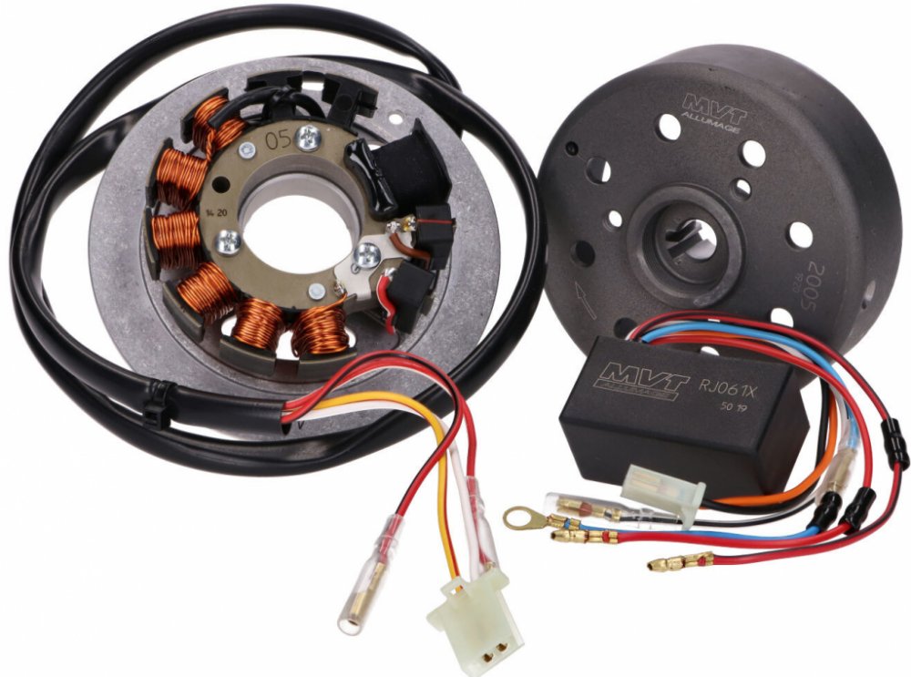 Zapalování MVT Millenium, Minarelli s Yamaha rotorem, do r.v. 2003 - Pokud chcete lepší zapalování, a nechcete přijít o osvětlení, a další elektrická zařízení na skútru, tak pro Vás máme tohle zapalování od MVT. Zapalování má odlehčený rotor, se kterým lze točit až 15t ot./m. Díky většímu počtu cívek jsou zajištěny funkce, o které by jste instalací zapalování s vnitřním rotorem přišli. Zapalování jsou dodávány s CDI, a lze je bez problému připojit na stávající kabeláž na skútru. Je také vhodné na skútry, které jsou omezeny právě CDIčkem. CDI, které je dodávané k zapalování má napevno nastavenou jednu křivku zapalování. Pokud by Vám to nevyhovalo, tak lze dokoupit digitální CDI, kde je nastaveno 18 různých křivek.