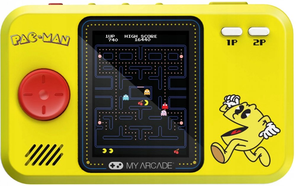 Herní konzole s retro designem od My Arcade s ikonickou hrou Pac-Man® s 2,75” plnobarevným displejem, vestavěným předním reproduktorem s ovládáním hlasitosti, ergonomickým designem, napájením buď 4 bateriemi AA (nejsou součástí balení) nebo kabelem USB-C (není součástí balení).
