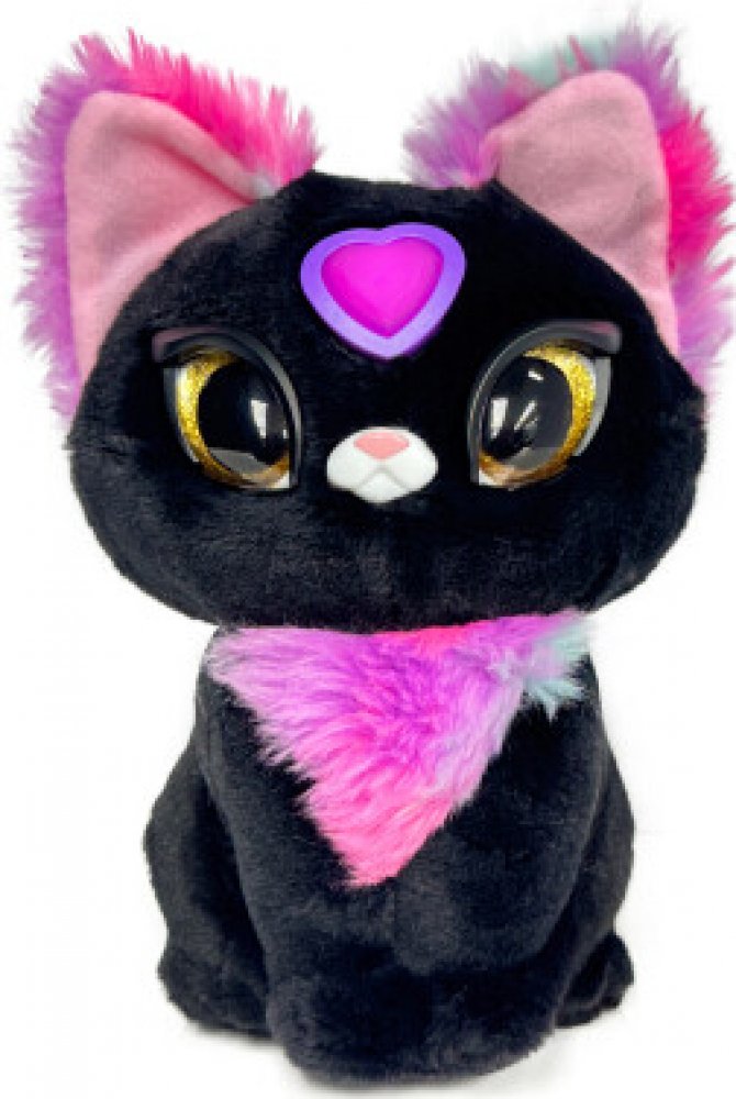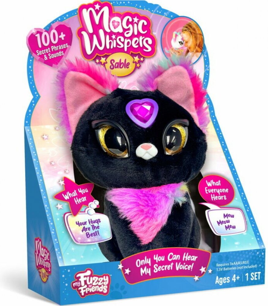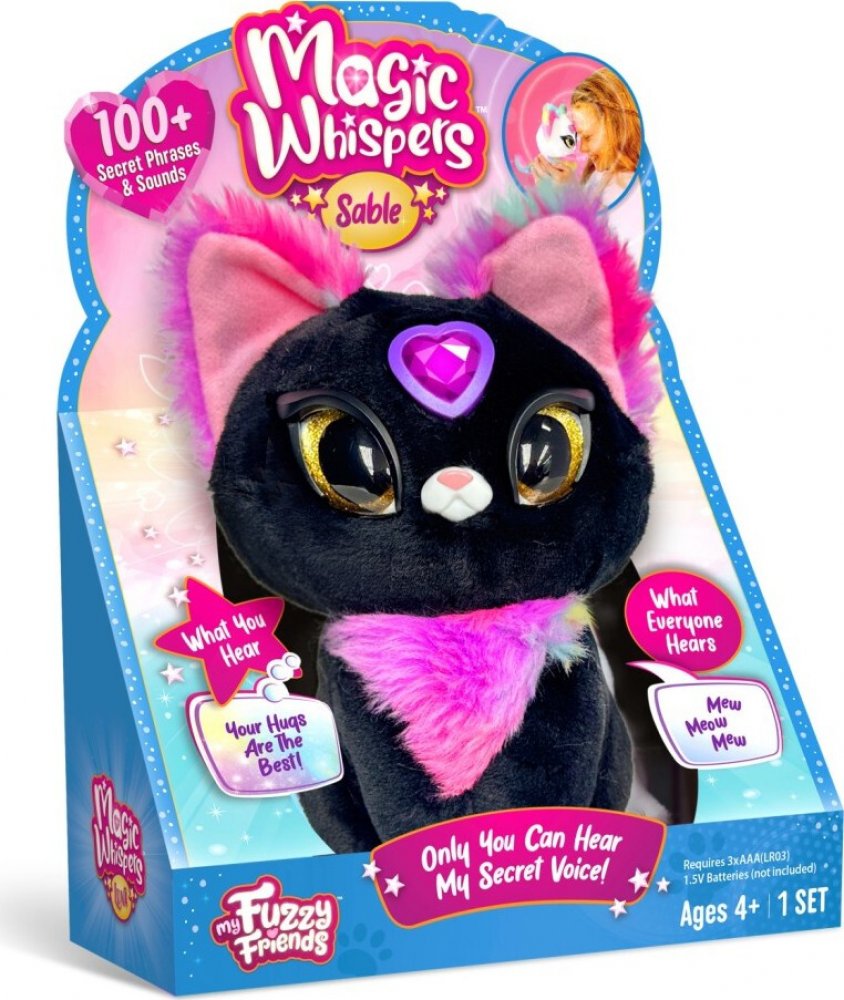 Rozměr balení cca 19 x 27 x 9 cm (D x V x Š),My Fuzzy Friends Magická zvířátka Sable je interaktivní plyšová kočička, která zaujme děti svým neobvyklým vzhledem a kouzelnými funkcemi. Kočička je vyrobena z měkkého černého plyše, který jepříjemný na dotek, a zdobí ji výrazné detaily v podobě růžovo-fialového huňatého kožíšku na hrudi a uvnitř uší. Její velké oči jsou lesklé a zlatě zbarvené, což jí dodává živý a přátelský výraz. Na čele má růžový plastový krystal ve tvaru srdce, který slouží jako aktivátor jejího speciálního tajného hlasu.Tato hračka nabízí více než 100 tajných frází a zvuků, které mohou děti slyšet pouze po přiložení krystalu k čelu a stisknutí tlačítka. Díky tomu je možné s kočičkou komunikovat ve třech režimech hraní: vtipná kočička, tajné povídání a věštba.Potřebné baterie 3x AAA, nejsou součastí balení.