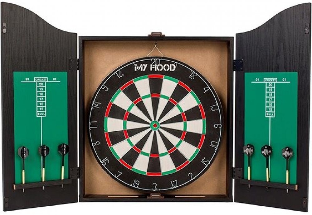 Domácí šipkové centrum tvoří skříň na šipky z laminované MDF v pěkném černém provedení, které je vhodné na zahradu nebo do herny. Oboustranný terč na šipky lze otočit tak, že na jedné straně jsou klasické šipky a na druhé "terčová hra". Na vnitřní straně dvířek jsou dvě výsledkové tabule. Součástí balení je i 6 mosazných šipek s distančními rozpěrkami a letkami, 2 křídy, hadřík a montážní materiál...