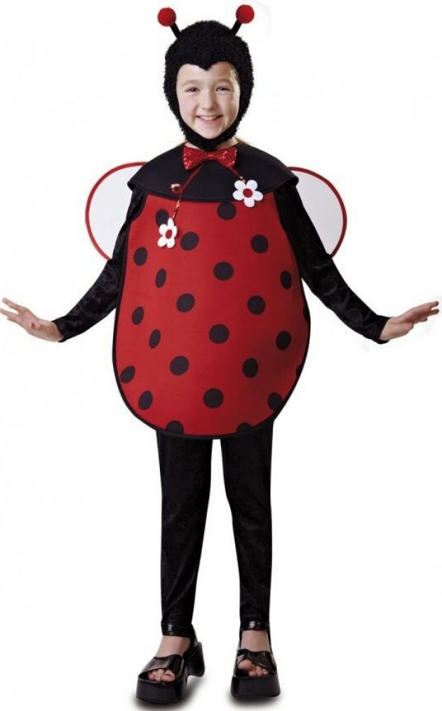 Červené polstrované body bez rukávů s černými puntíky má vrchní část černou a u krku červenou flitrovou mašli, která je doplněná bílými kytičkami. Kostým doplňují černá průhledná červeně lemovaná křídla, která jsou přichycena suchým zipem, a chlupatá černá čepice s červenými tykadly. Čepice je na suchý zip pod krkem.