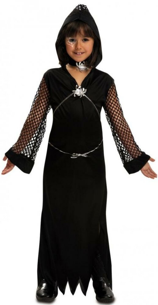 dlouhé černé šaty s rozšířenými rukávy a kapucí. Velký límec a pásek jsou lemované stříbrnou látkou, zdobeny stříbrnými lebkami a pošity řetízkem.